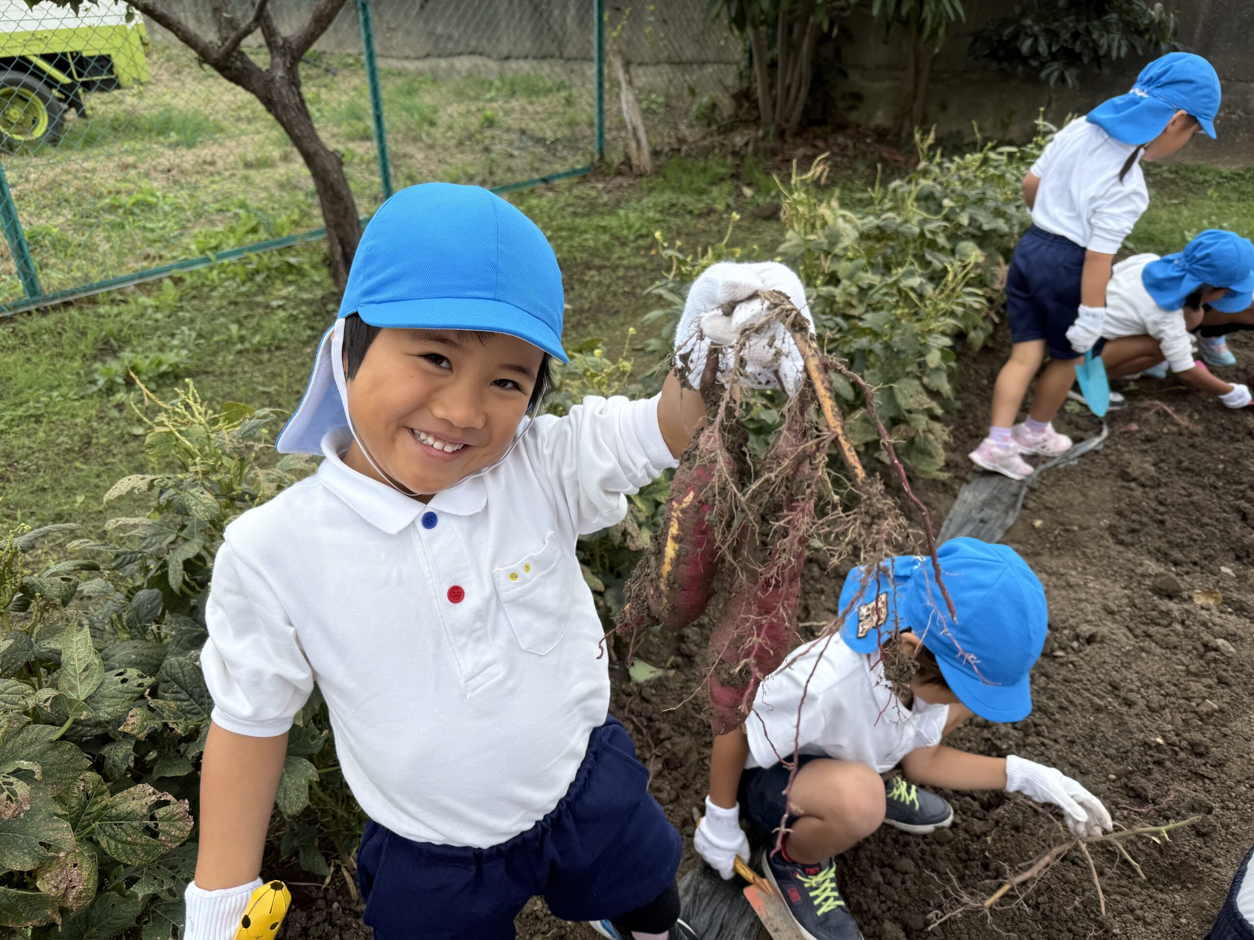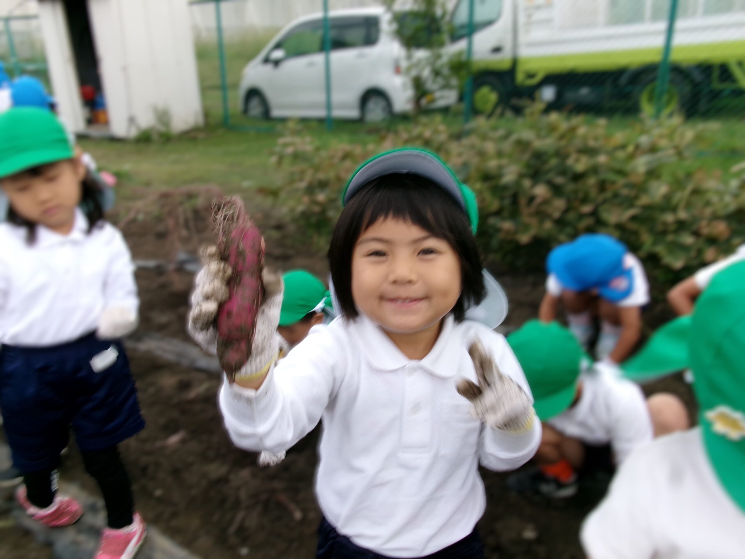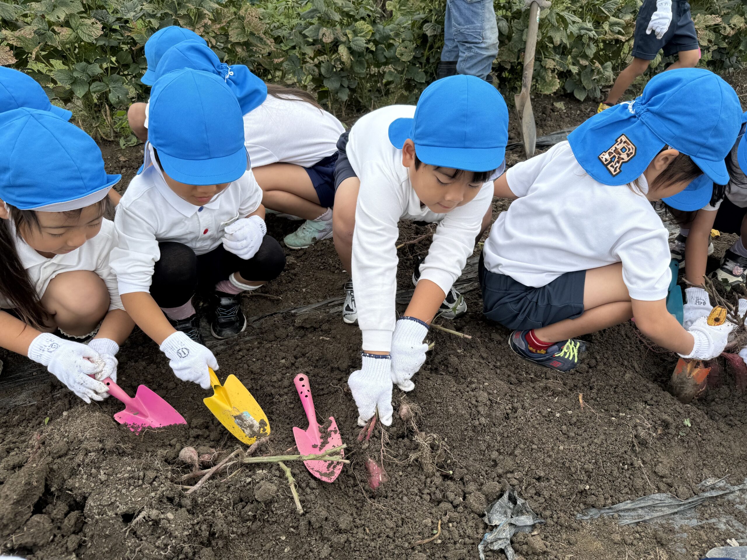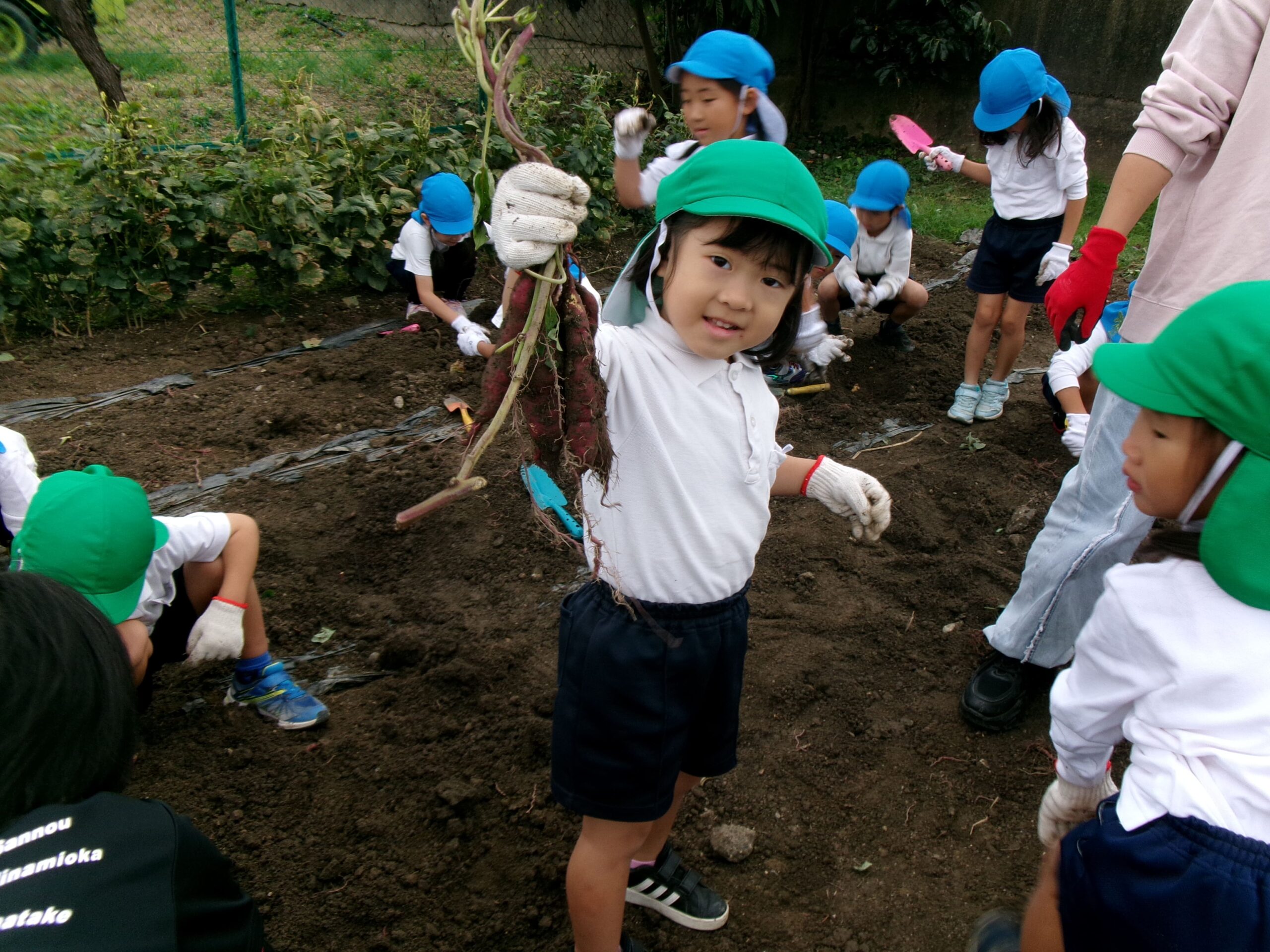地域の方にお誘いいただき、『ふれあい農園』に4歳児と5歳児がいもほりに出かけました。掘り方を教えて頂き、いもほり大会の開始!大きな芋や小さい芋、細長い芋などさまざまで、みんな大喜びでした。土の中から顔が出ているのになかなか姿が見えないお芋を数人で「よいしょ!よいしょ!」と引っ張ったり、掘ったりして友達と協力する姿も見られました。地域のみなさま、ありがとうございました。
