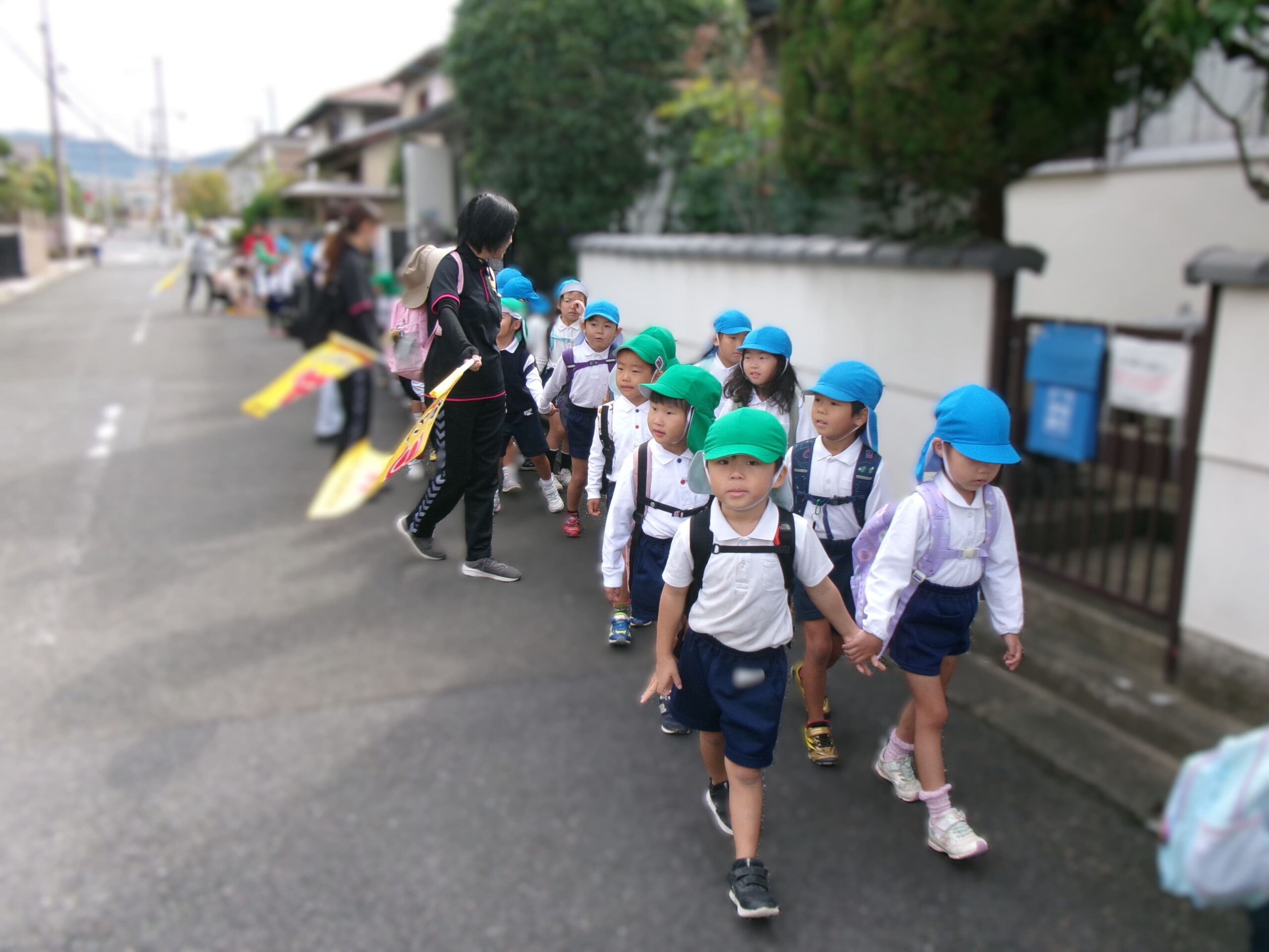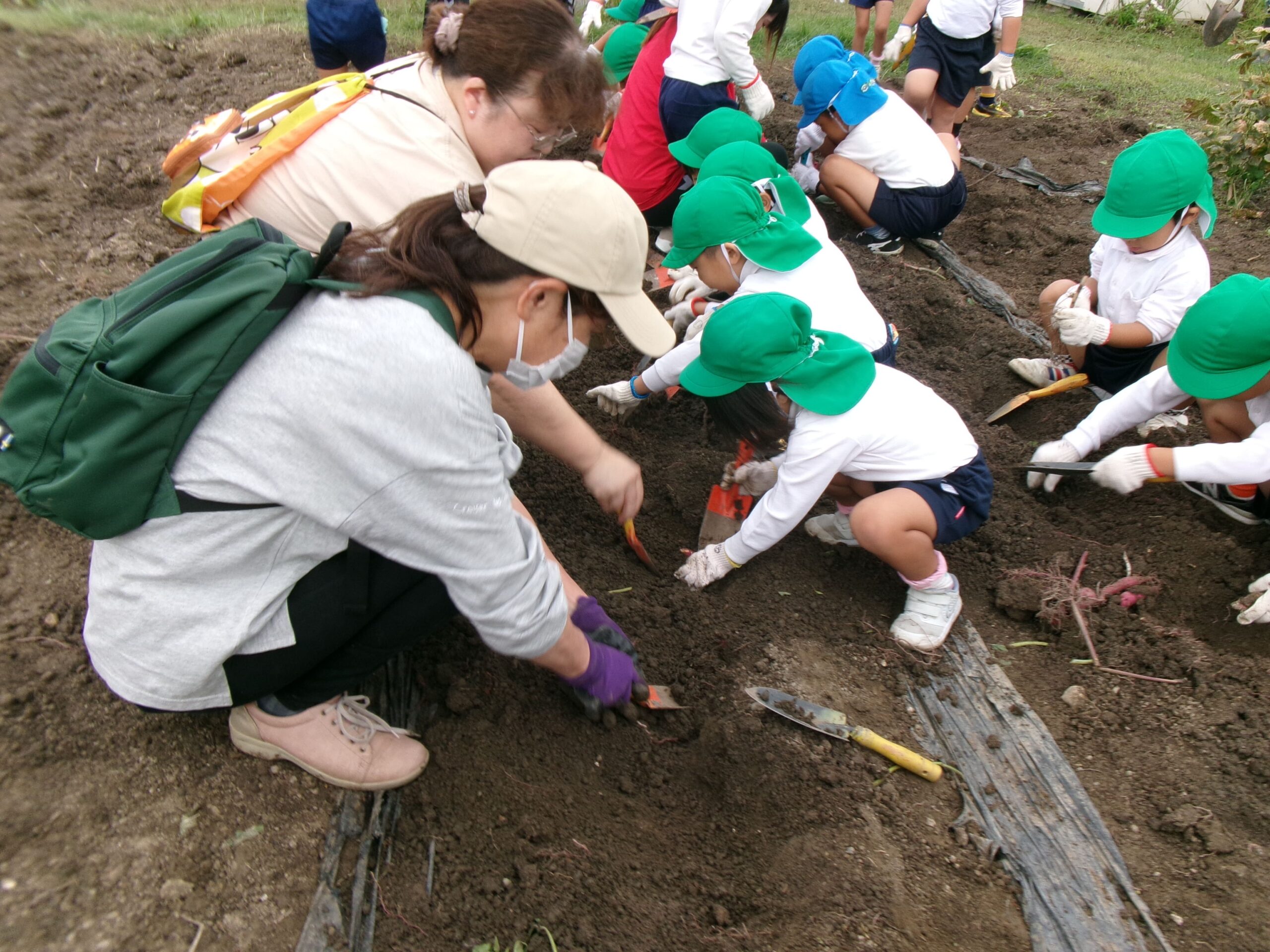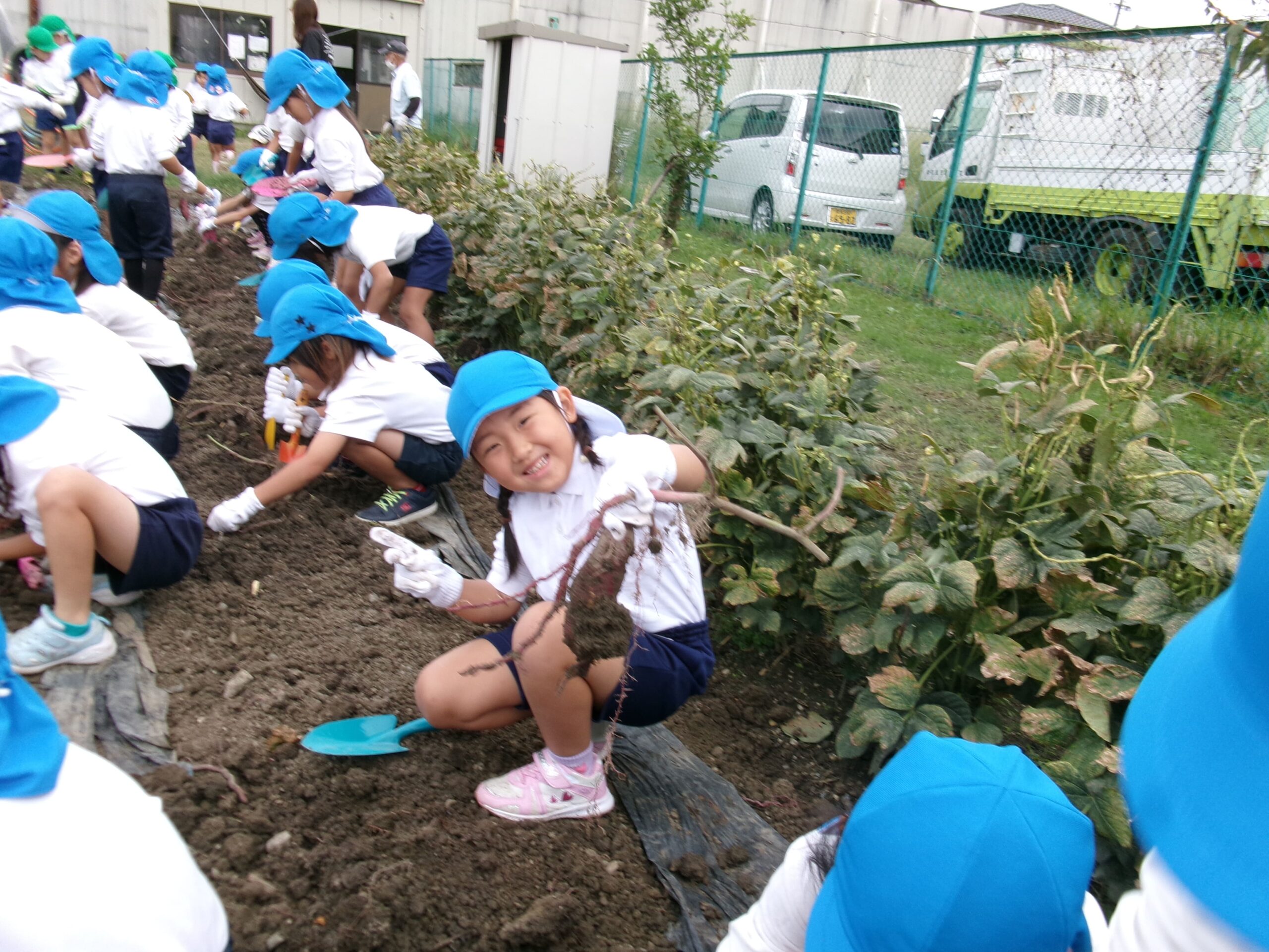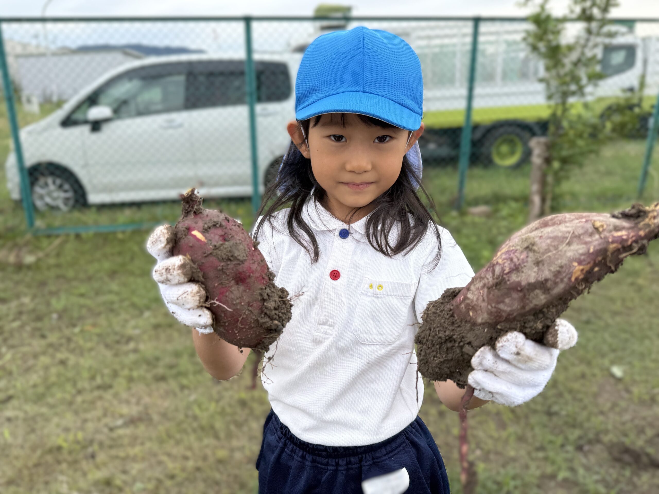 地域の方にお誘いいただき、『ふれあい農園』に4歳児と5歳児がいもほりに出かけました。掘り方を教えて頂き、いもほり大会の開始!大きな芋や小さい芋、細長い芋などさまざまで、みんな大喜びでした。土の中から顔が出ているのになかなか姿が見えないお芋を数人で「よいしょ!よいしょ!」と引っ張ったり、掘ったりして友達と協力する姿も見られました。地域のみなさま、ありがとうございました。