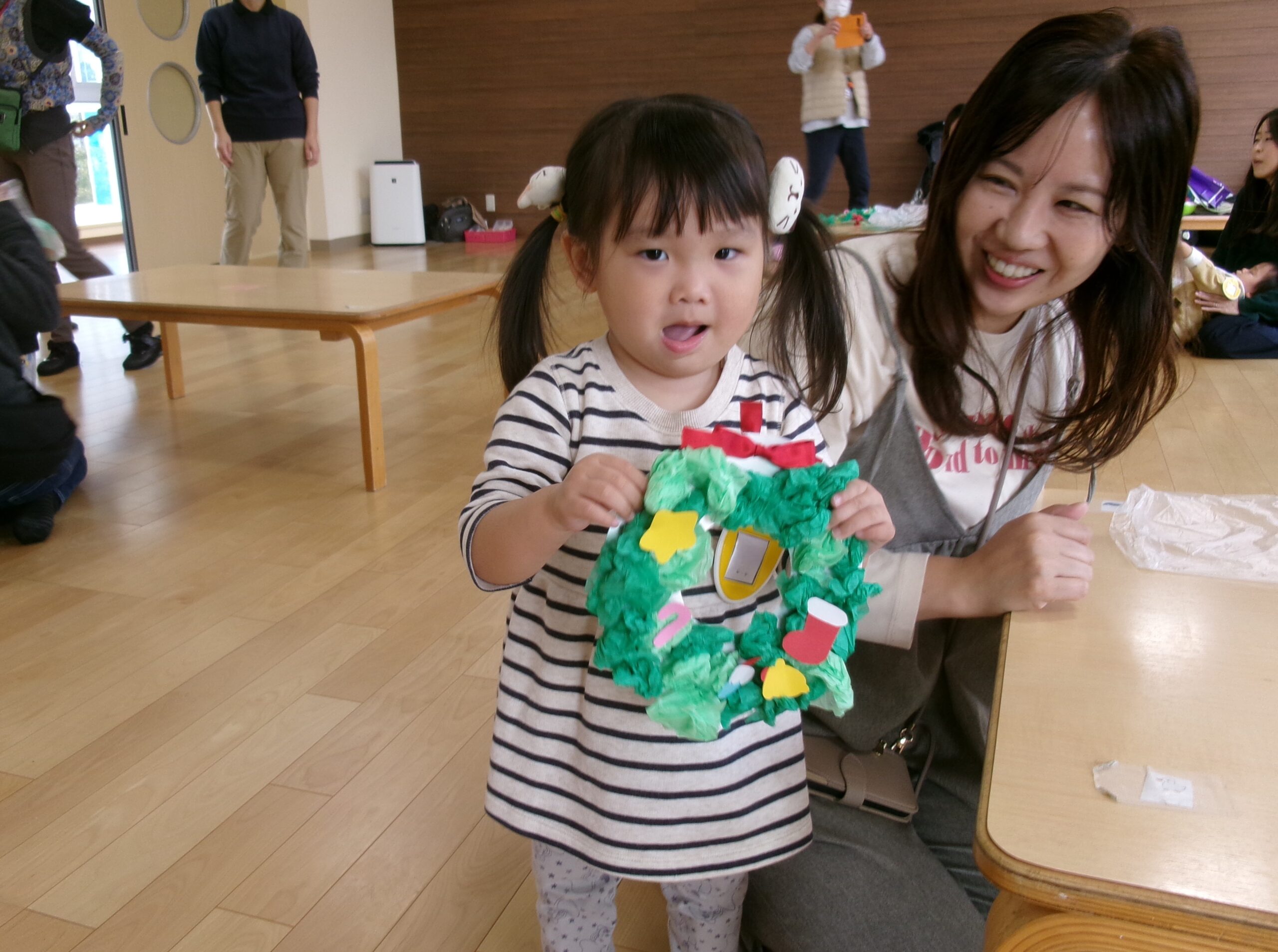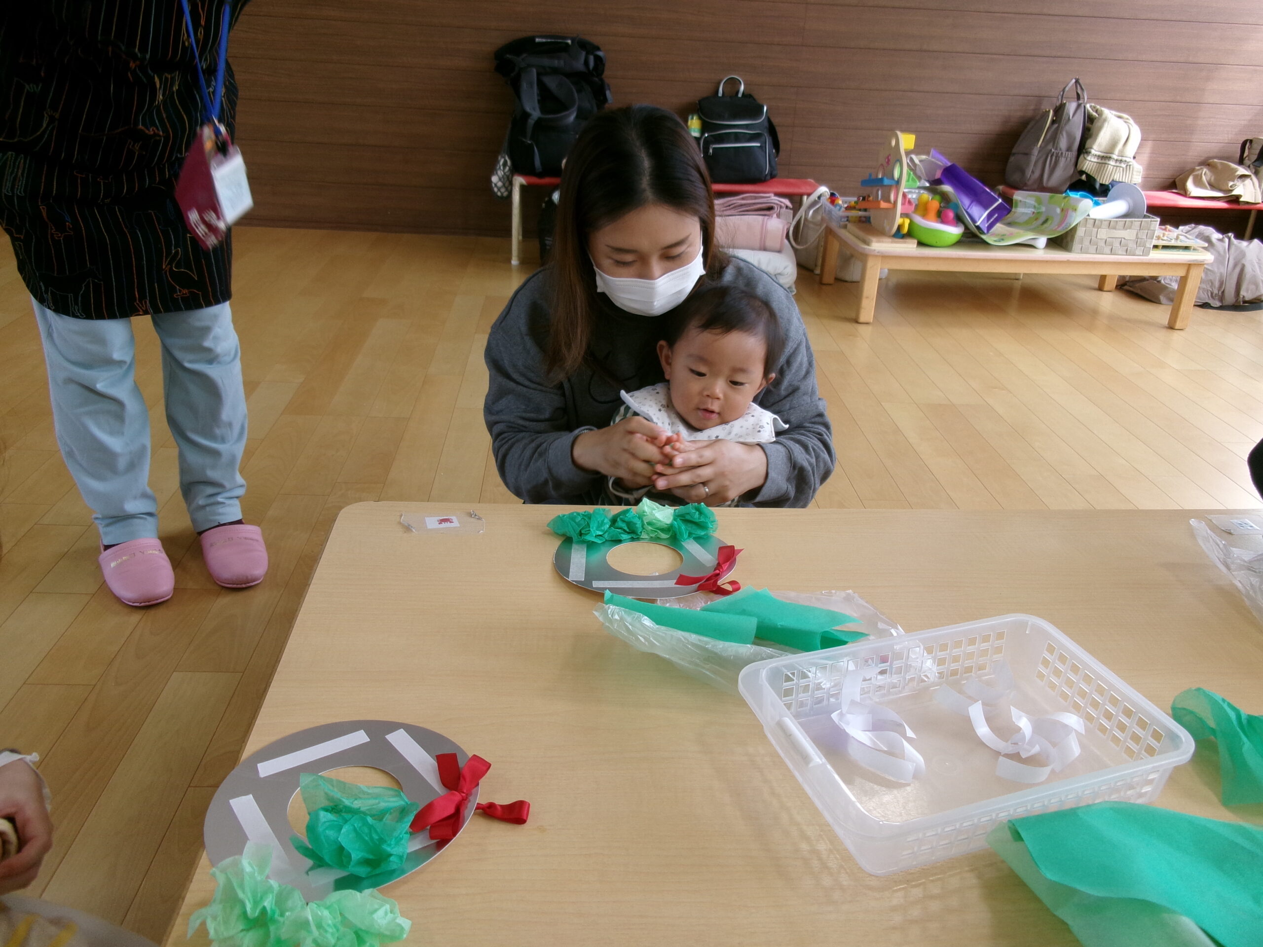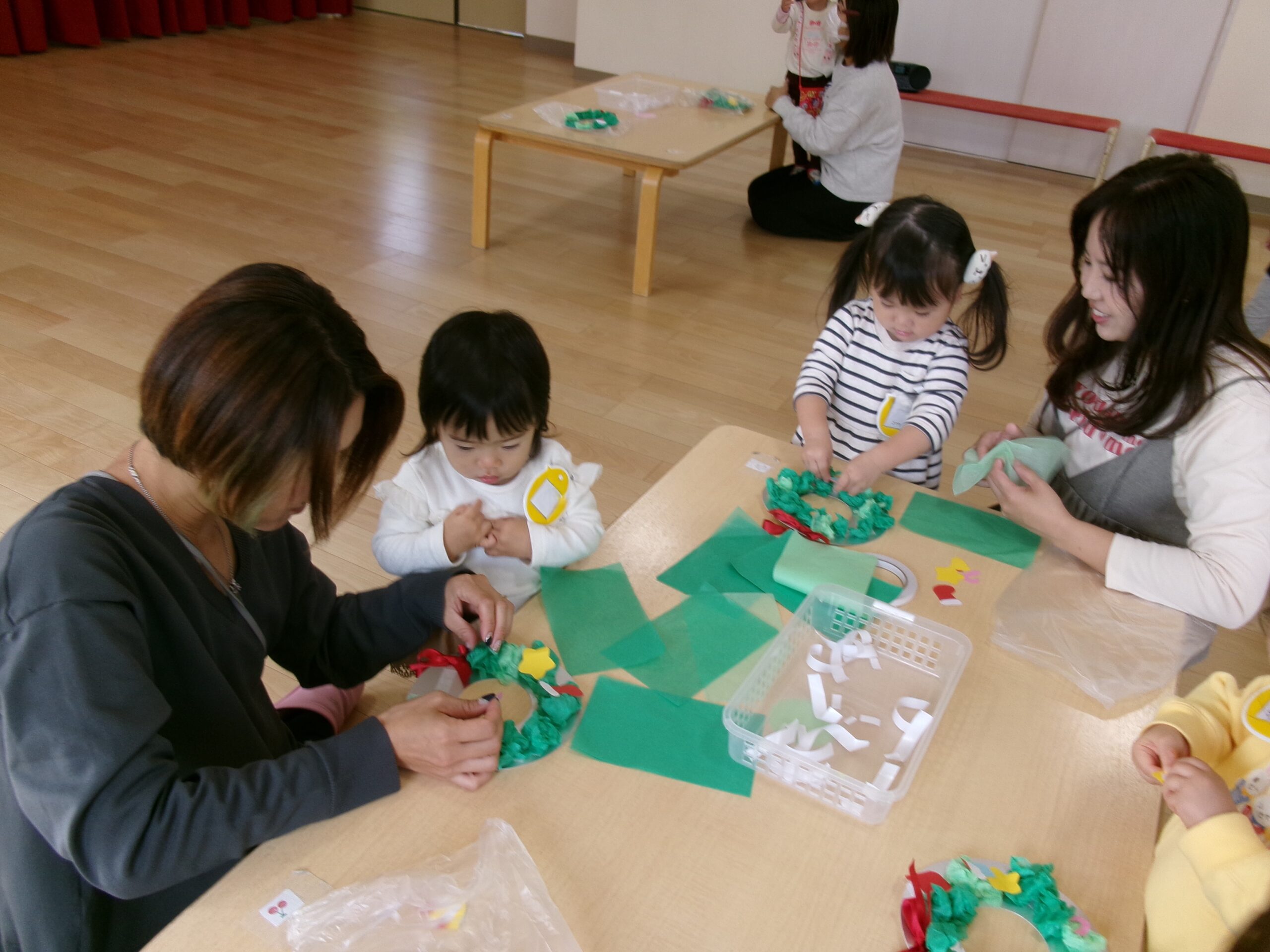 ぽかぽかといいお天気の中、今日もひよこ組のかわいいお友達が元気に遊びに来てくれました。来月12月は、みんなが楽しみに待っているクリスマスがあります。少し早いですがクリスマスの絵本を見てリースを作りました。柔らかい紙を丸めて、貼っていきます。そしてブーツやお星さまのパーツを貼ったら出来上がりです。小さな手で、上手にくしゅくしゅと丸めたり、小さく小さくしっかりと丸めたのをたくさん貼ったりしてました。とてもかわいいリースが出来上がりましたよ。サンタさん、待ってるね☆また、暖かい日差しの中、園庭遊びを楽しみました。紅葉した落ち葉をたくさん集めて、何度もぱらぱらと降らせて遊んでいましたよ。また来月お持ちしていますね。