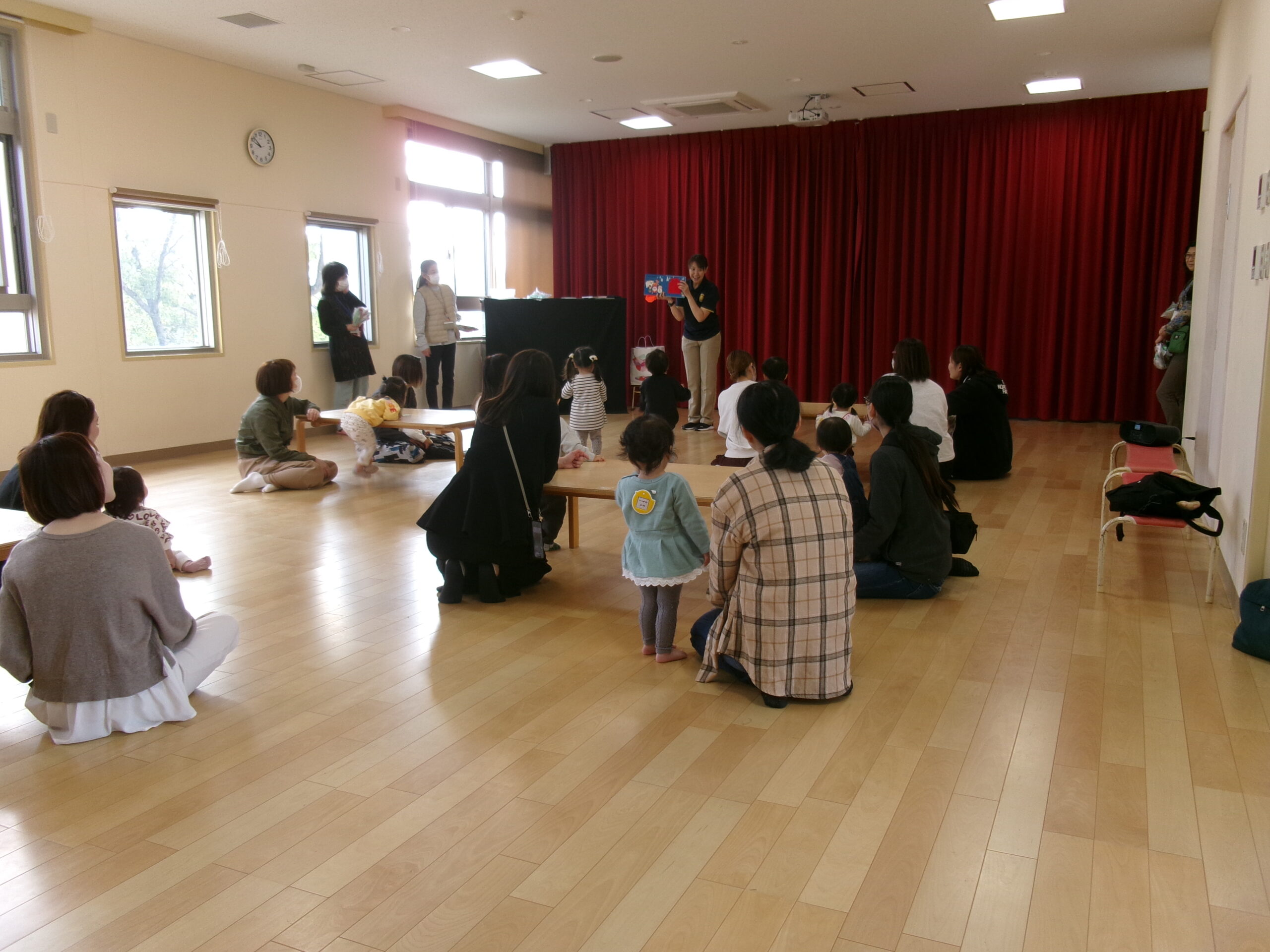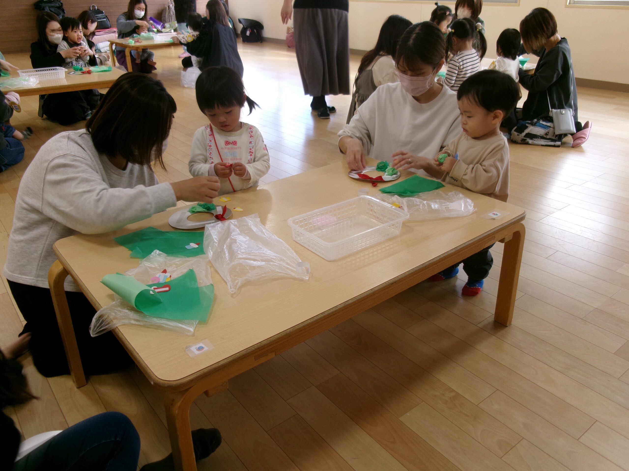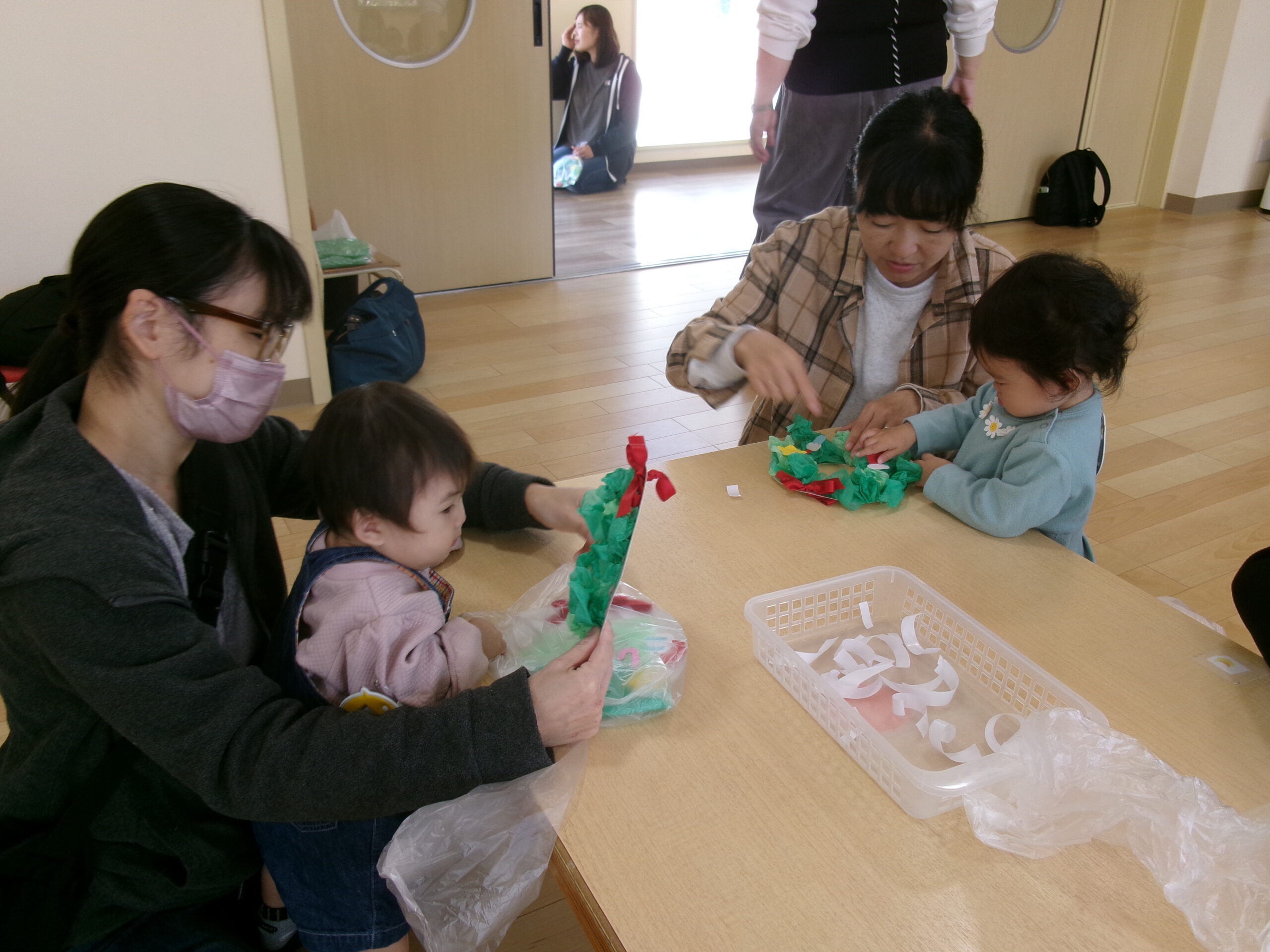 ぽかぽかといいお天気の中、今日もひよこ組のかわいいお友達が元気に遊びに来てくれました。来月12月は、みんなが楽しみに待っているクリスマスがあります。少し早いですがクリスマスの絵本を見てリースを作りました。柔らかい紙を丸めて、貼っていきます。そしてブーツやお星さまのパーツを貼ったら出来上がりです。小さな手で、上手にくしゅくしゅと丸めたり、小さく小さくしっかりと丸めたのをたくさん貼ったりしてました。とてもかわいいリースが出来上がりましたよ。サンタさん、待ってるね☆また、暖かい日差しの中、園庭遊びを楽しみました。紅葉した落ち葉をたくさん集めて、何度もぱらぱらと降らせて遊んでいましたよ。また来月お持ちしていますね。