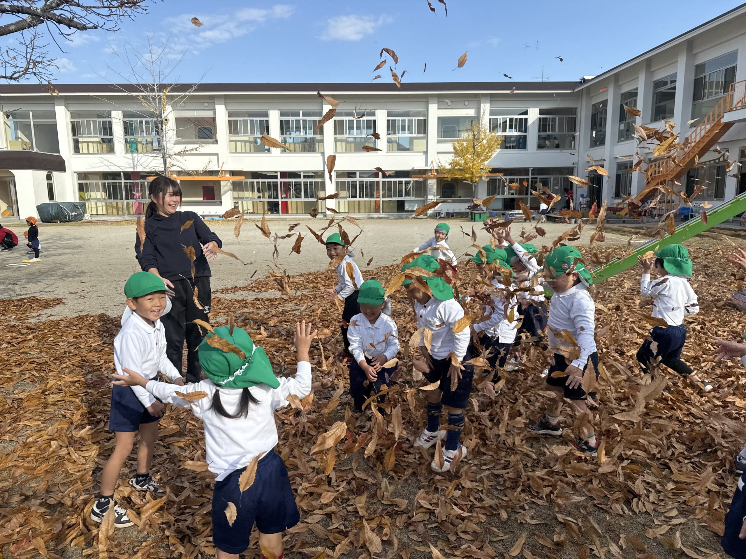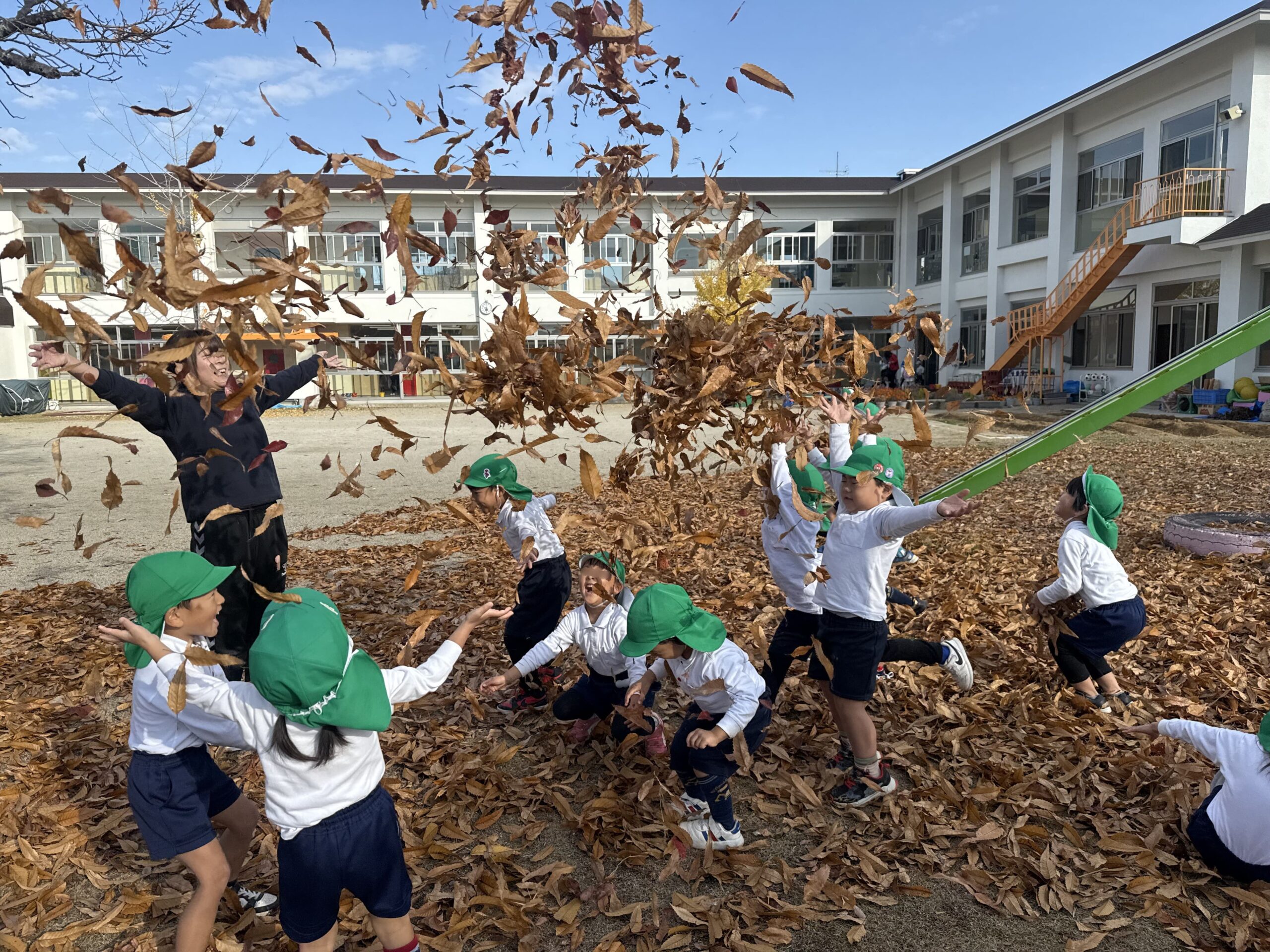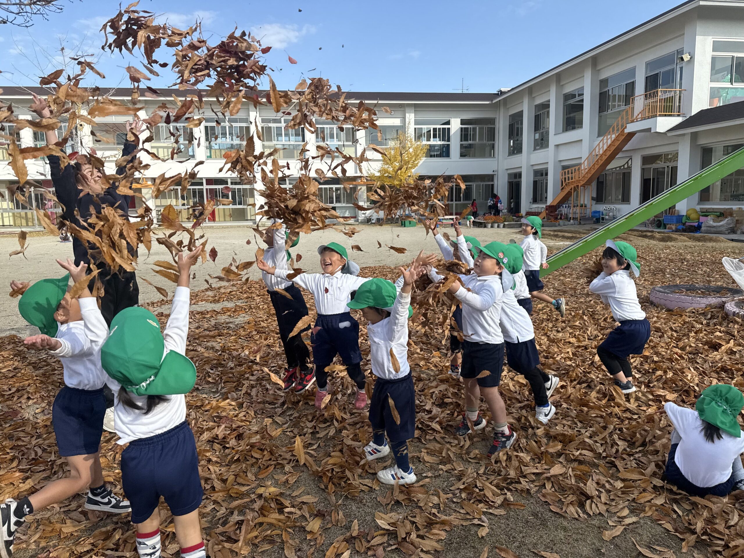 みんなで「せーの!」 落ち葉のシャワーだ~🍂
