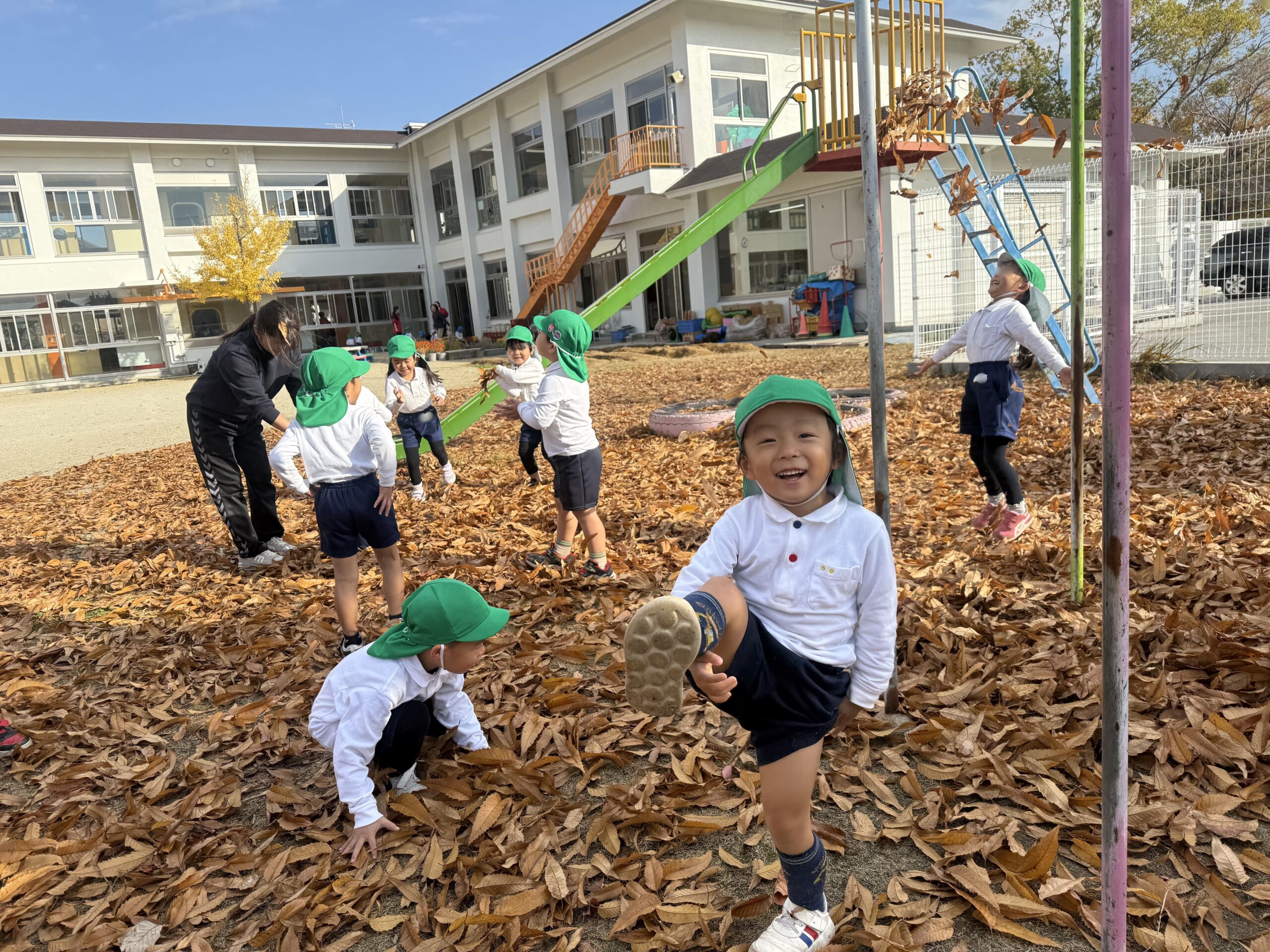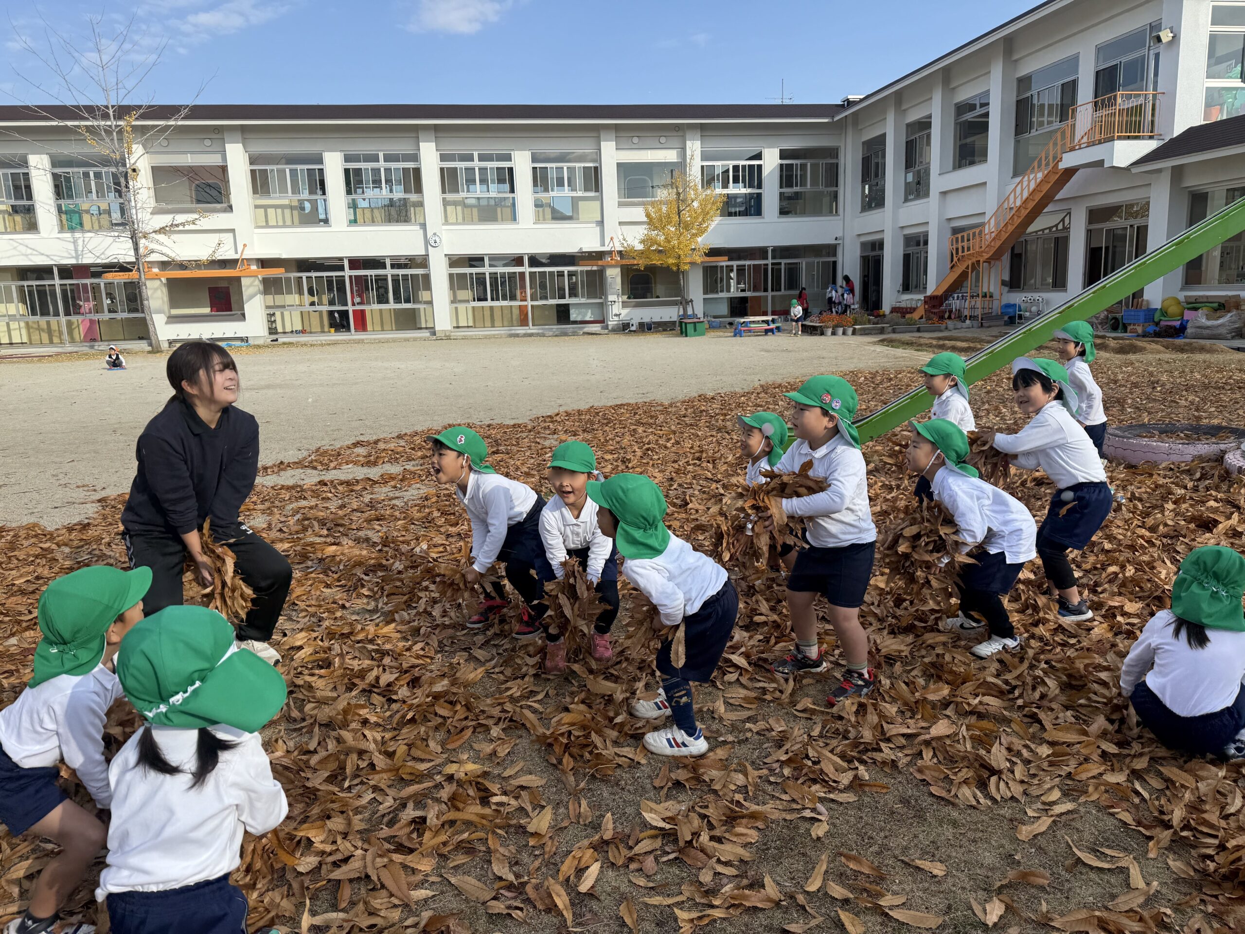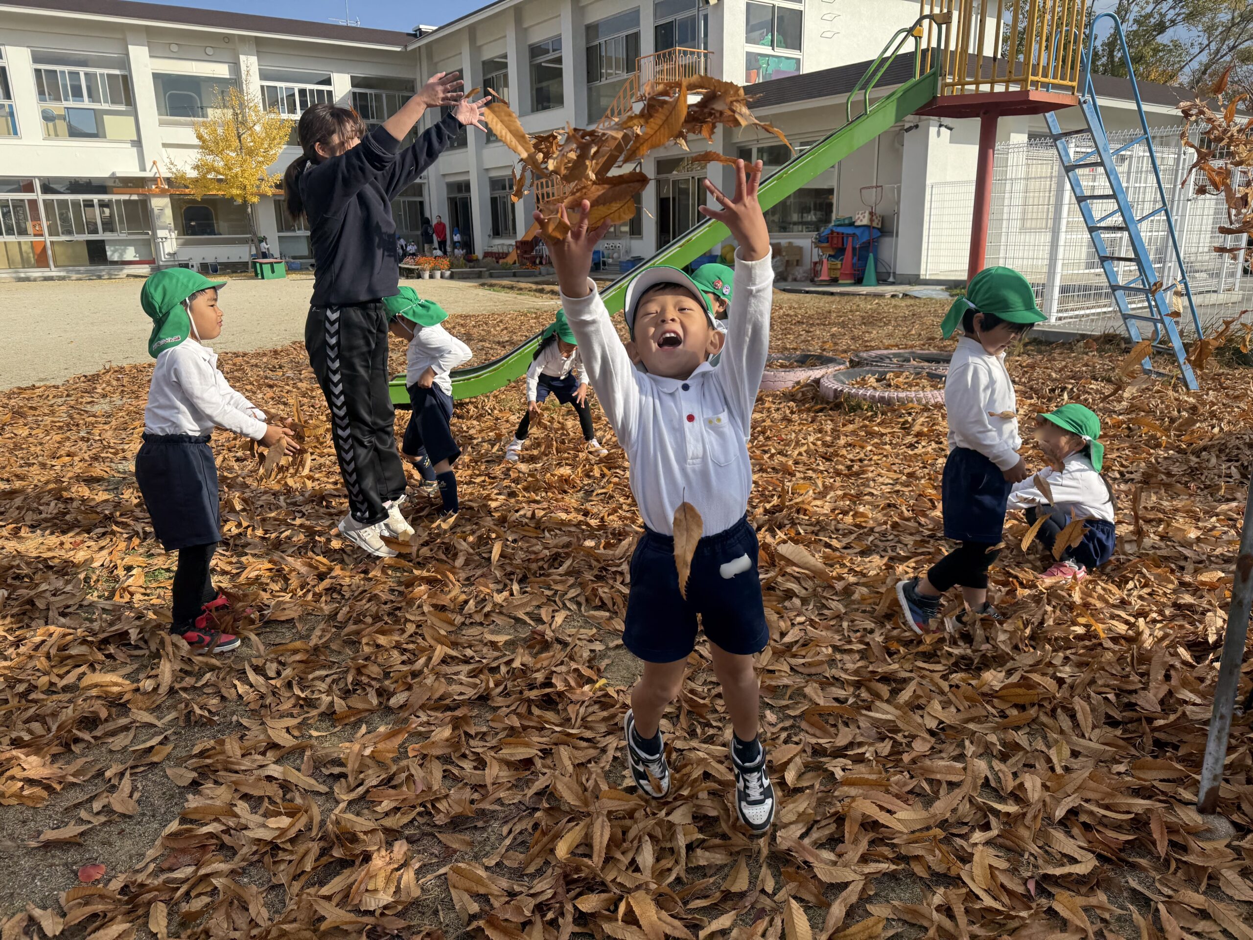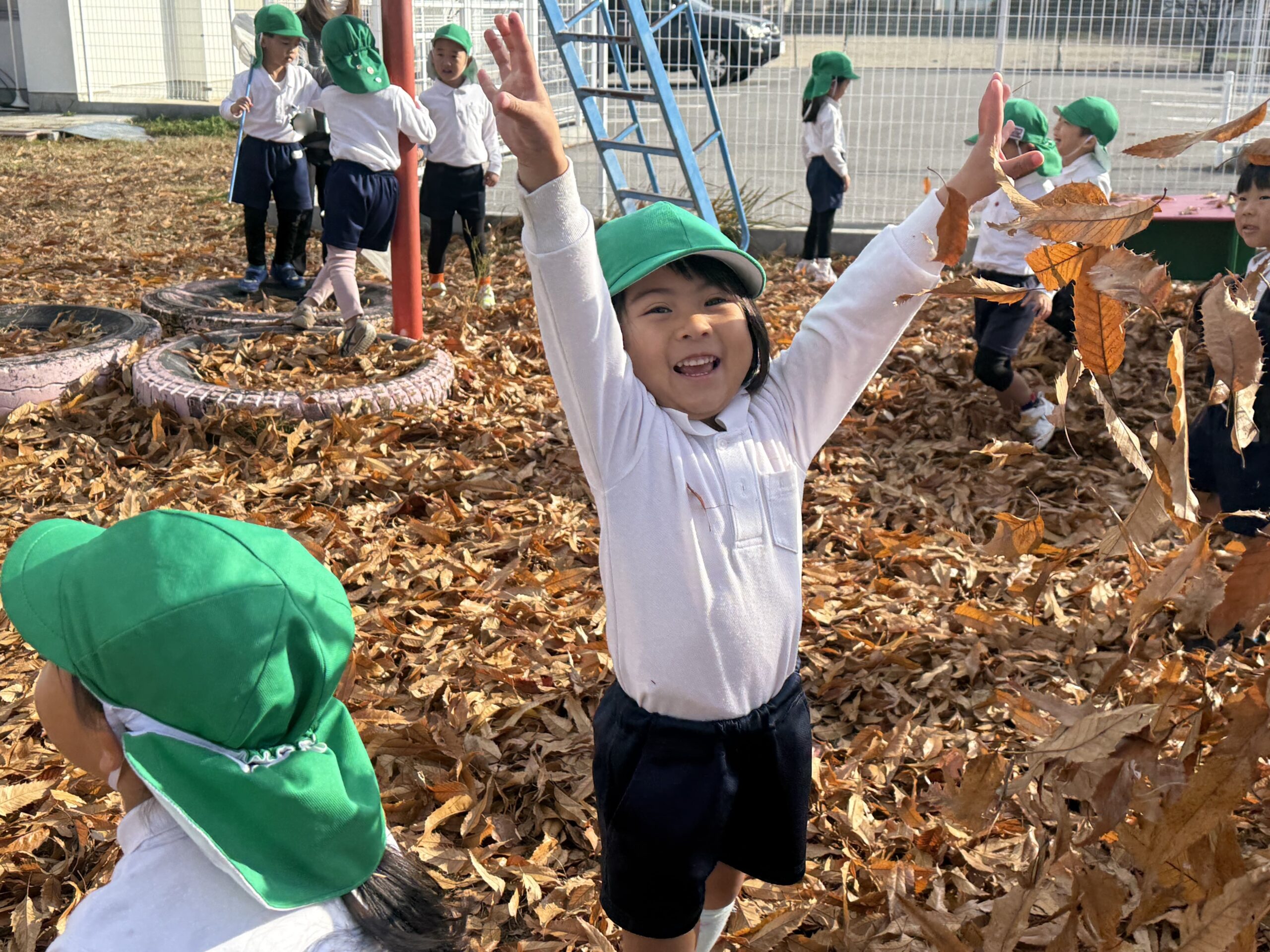 みんなで「せーの!」 落ち葉のシャワーだ~🍂