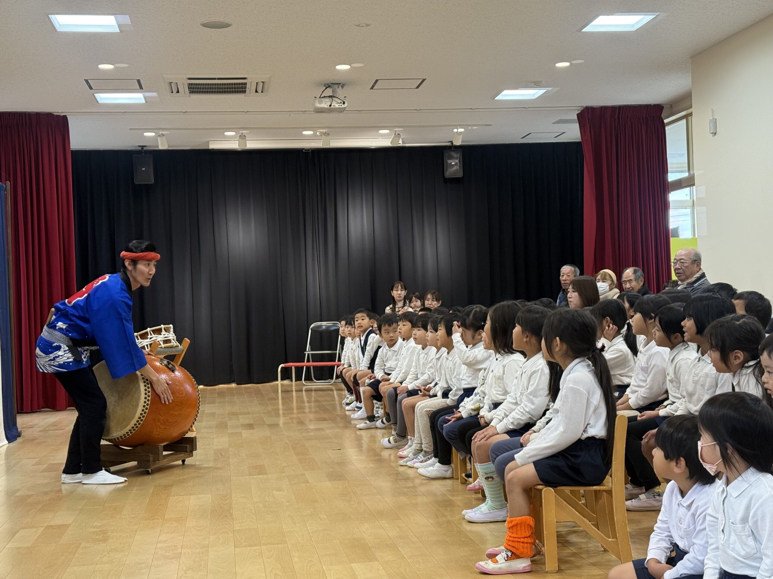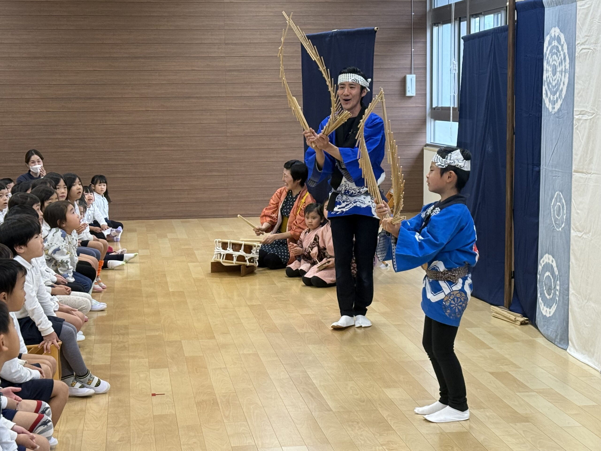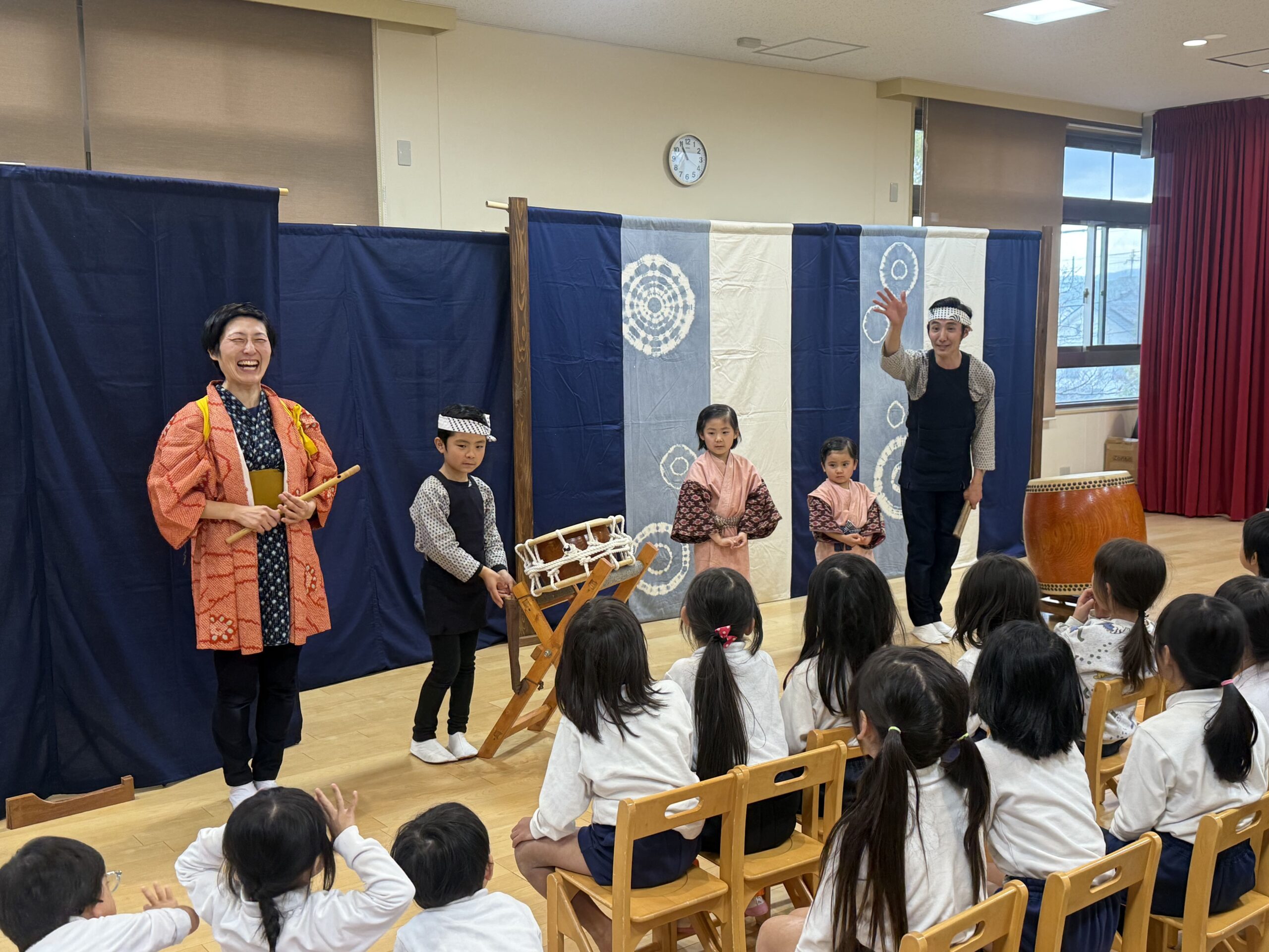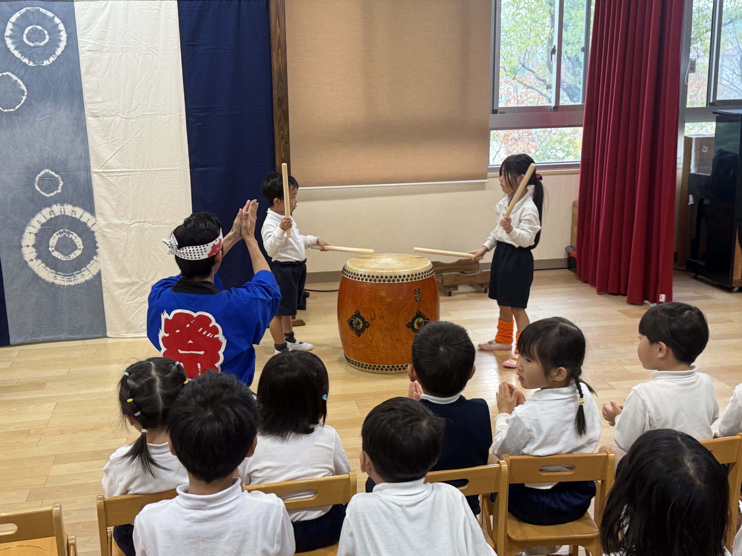 太鼓は何でできているかな?の質問から「”木”と”動物(牛)の皮”で大切な命をいただいて作られています。