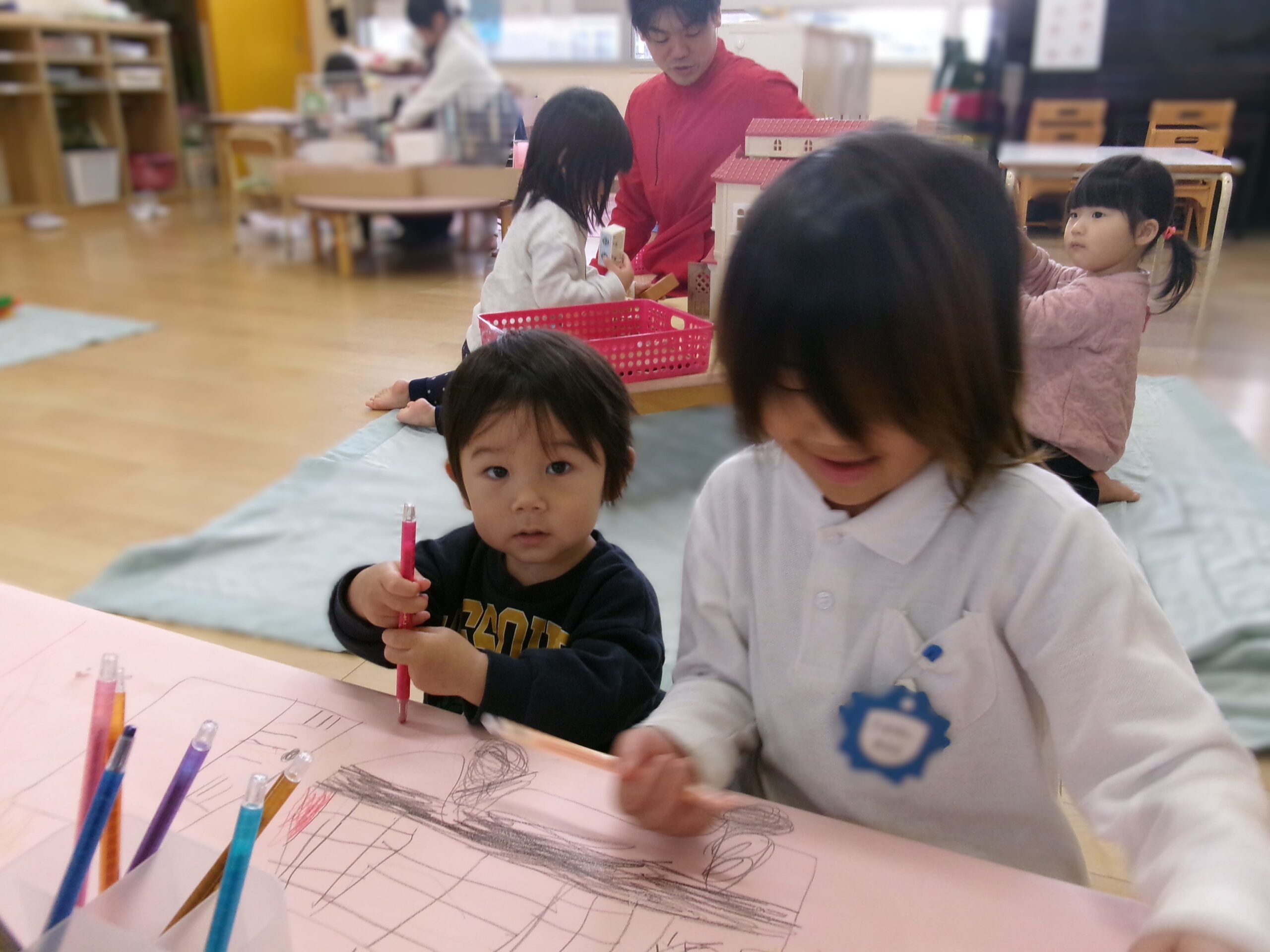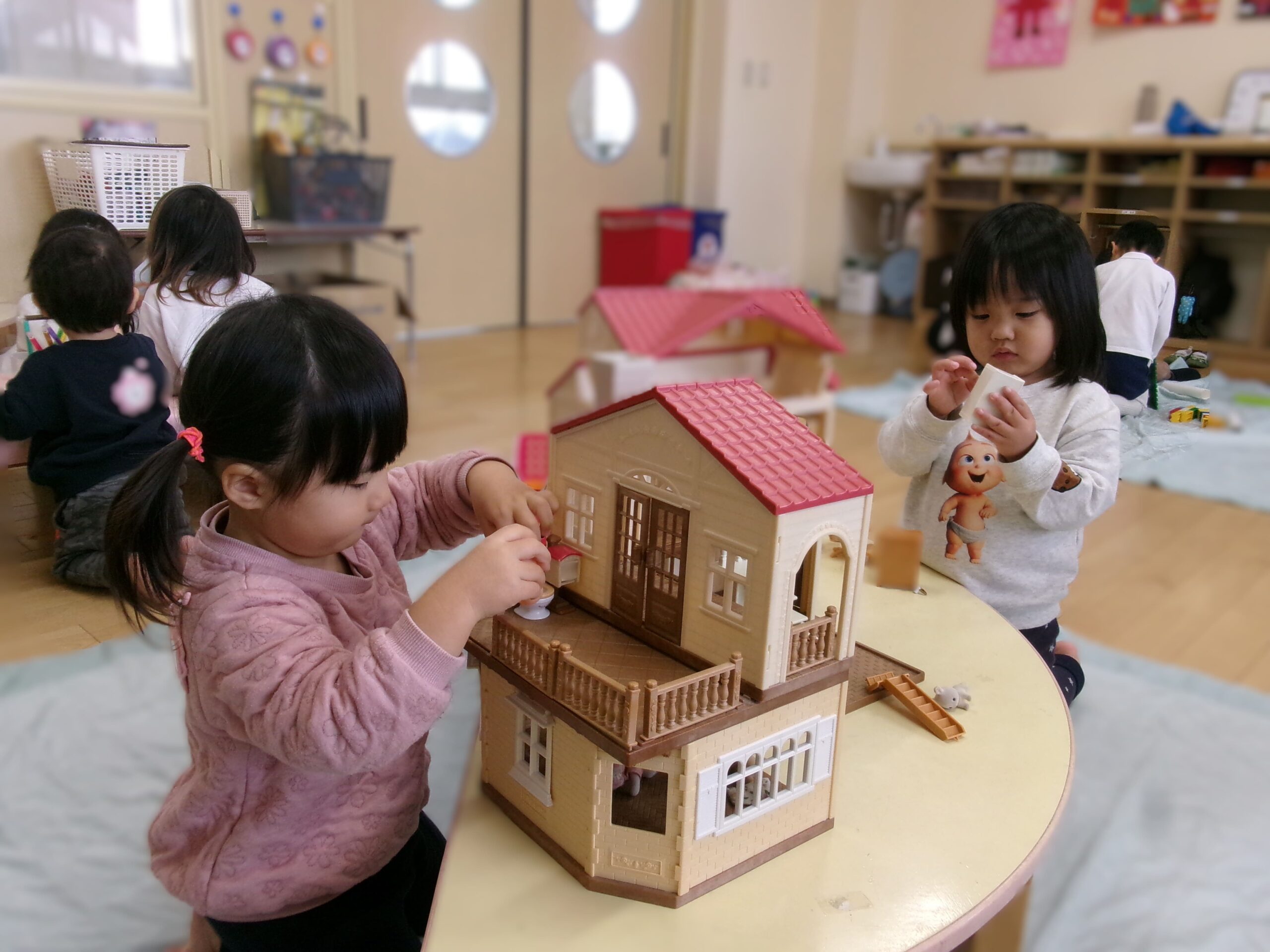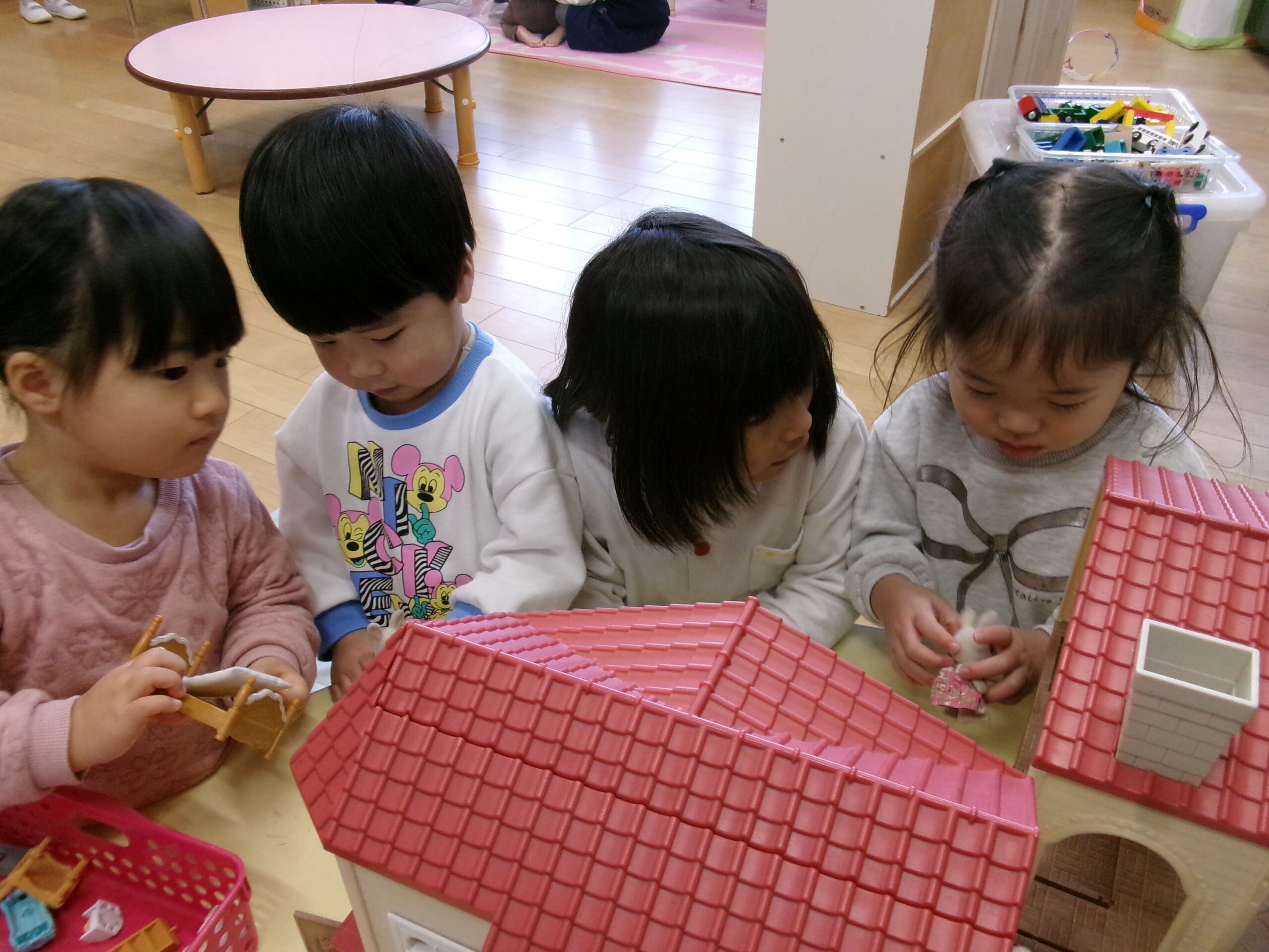 5歳児わっふる組のお部屋に入ると好きな遊びを見つけて集中して遊んでいた1歳児さん。いろんな遊びを一緒に楽しみました。