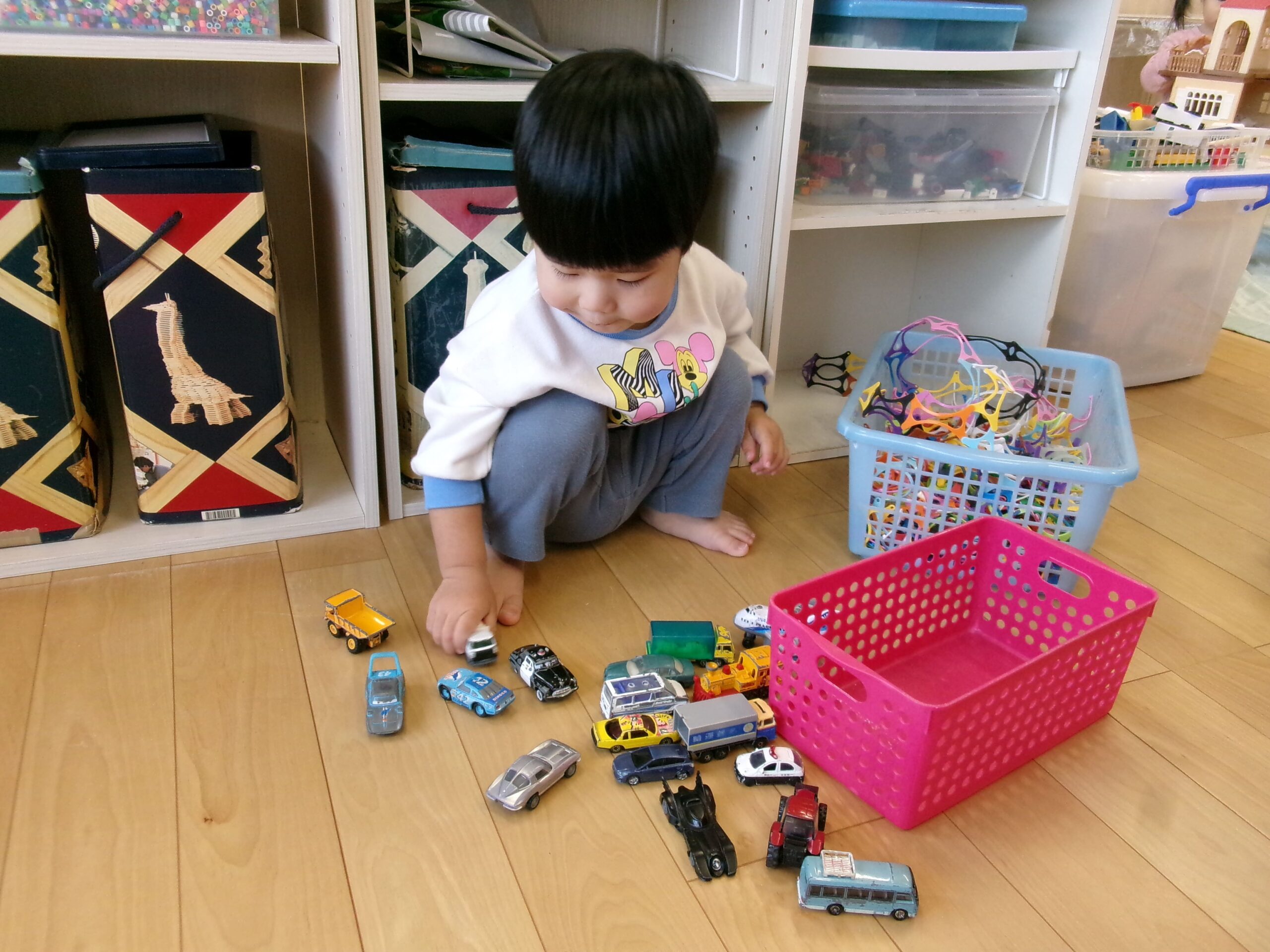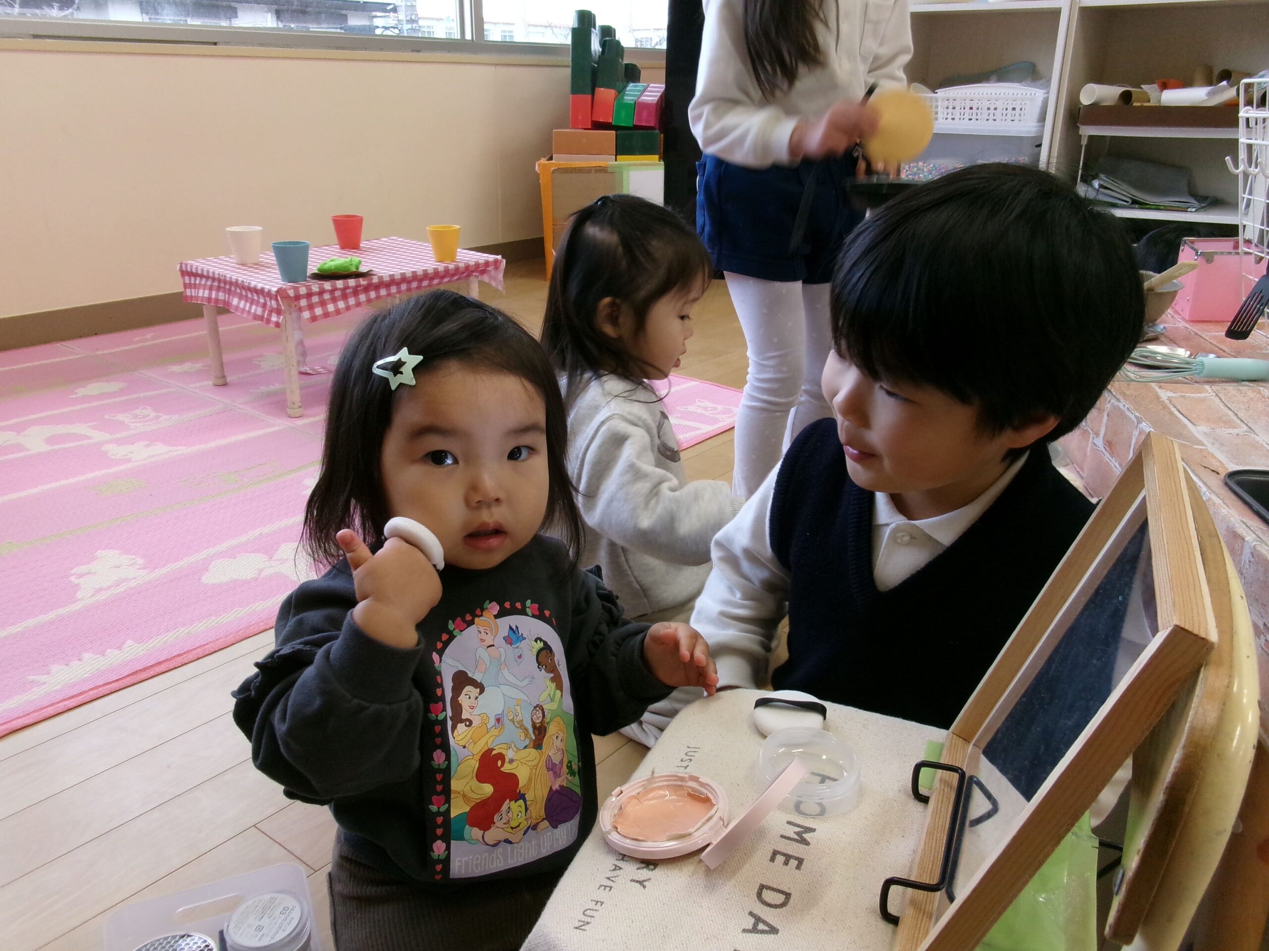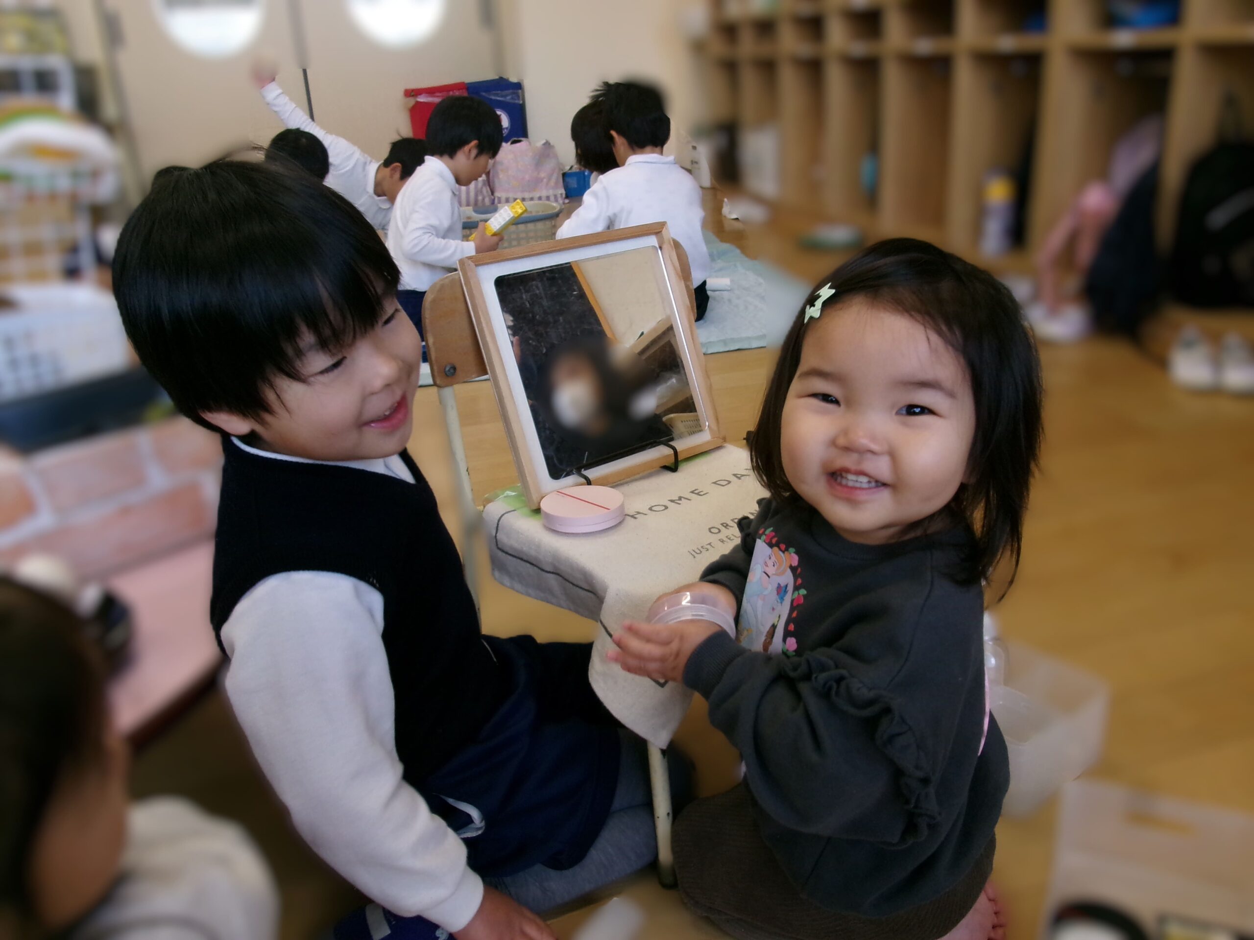 5歳児わっふる組のお部屋に入ると好きな遊びを見つけて集中して遊んでいた1歳児さん。いろんな遊びを一緒に楽しみました。