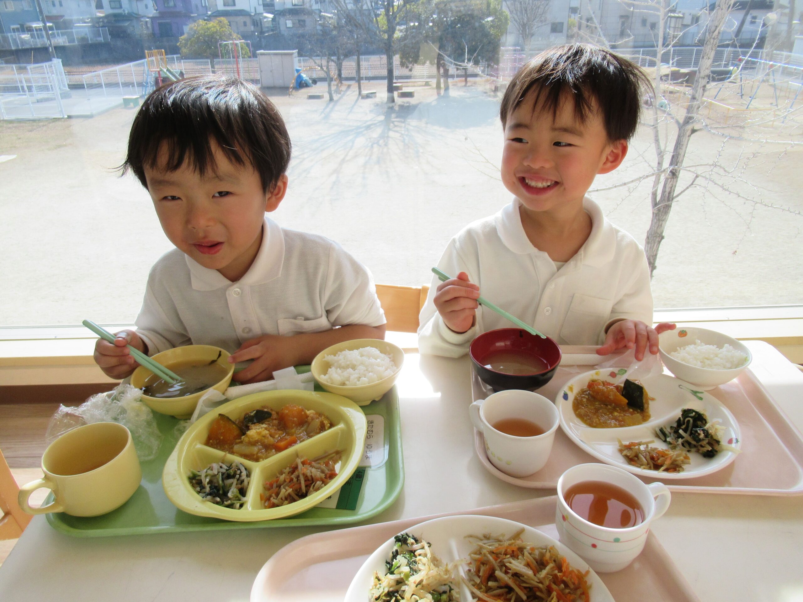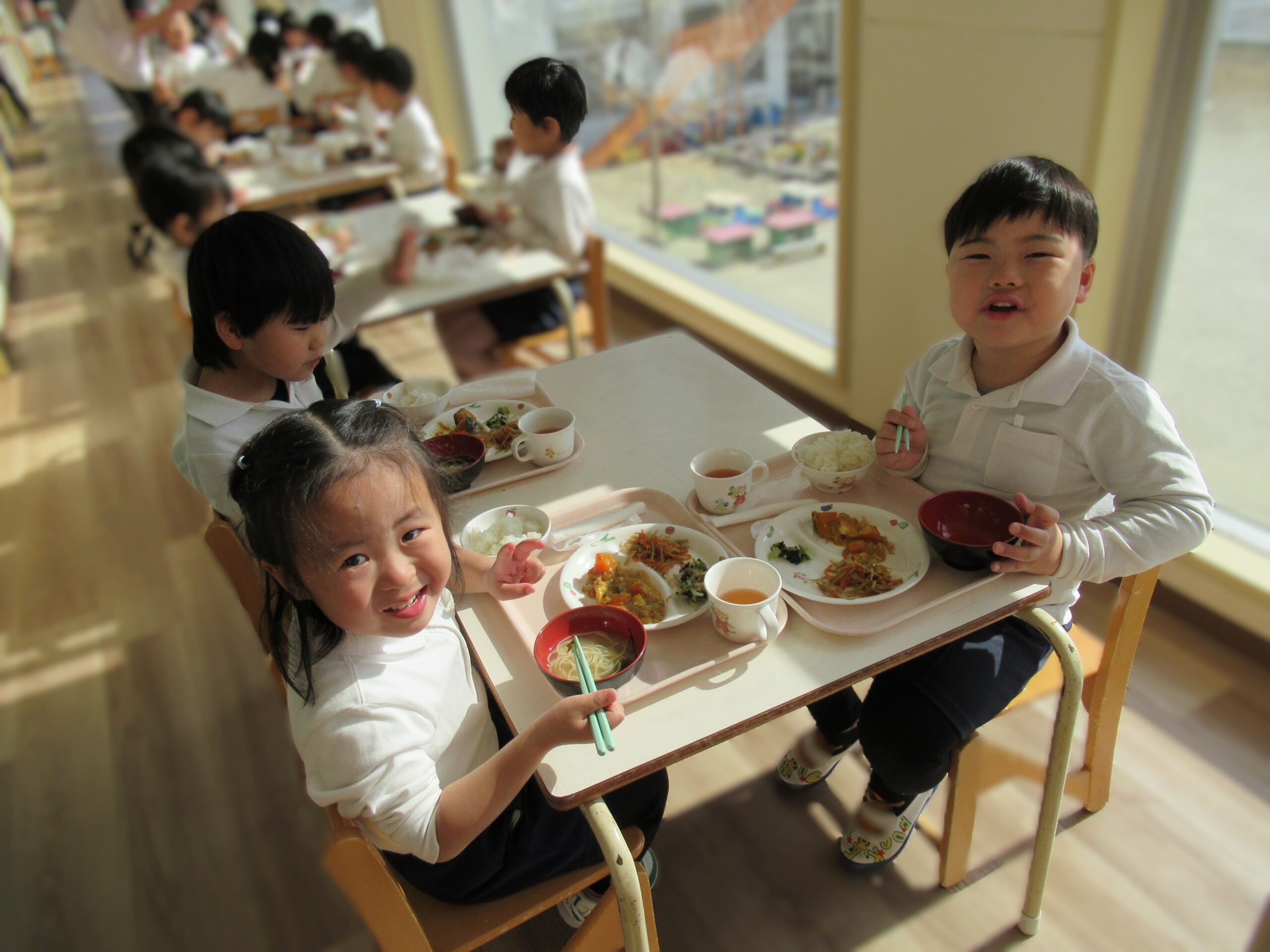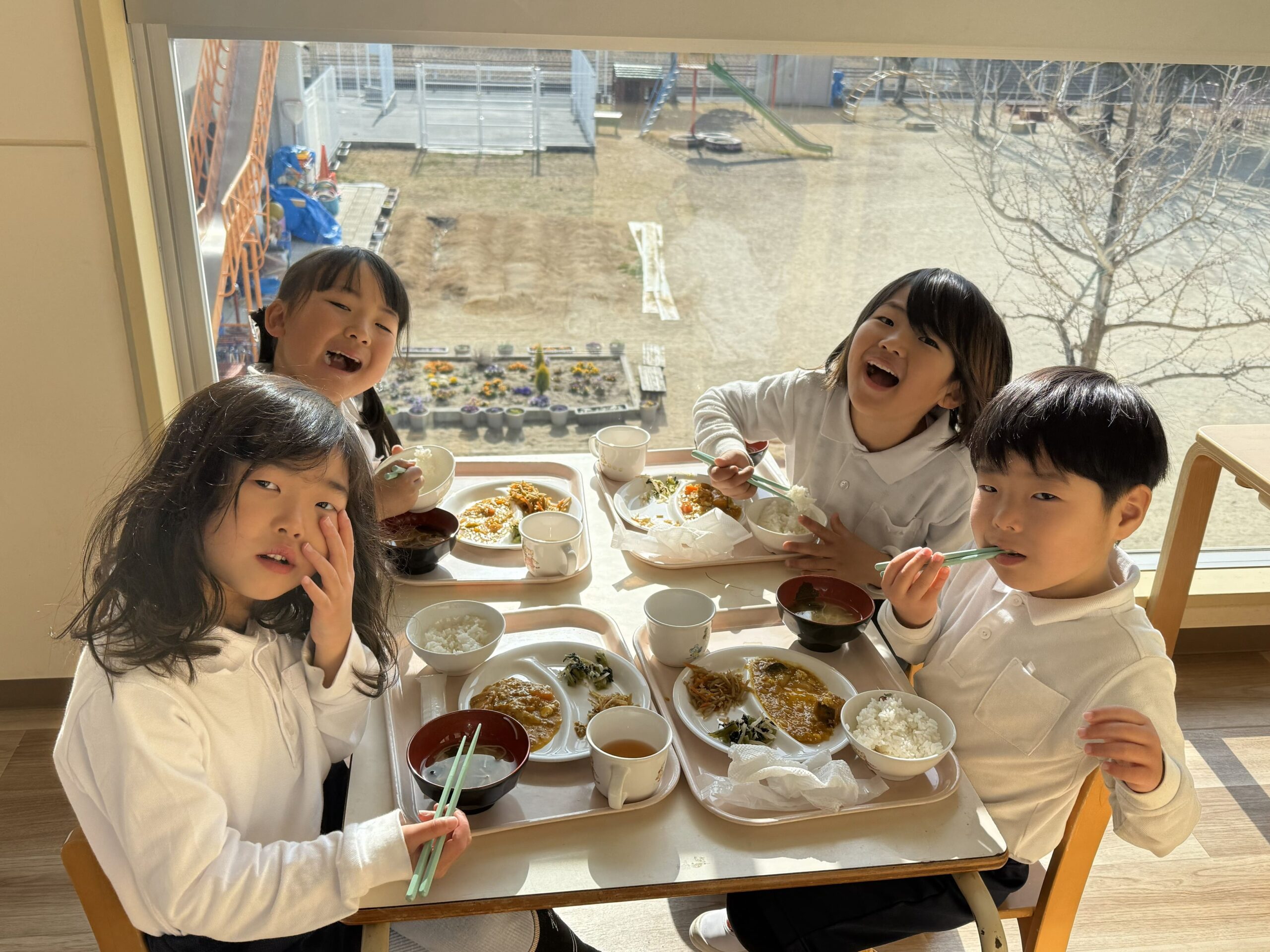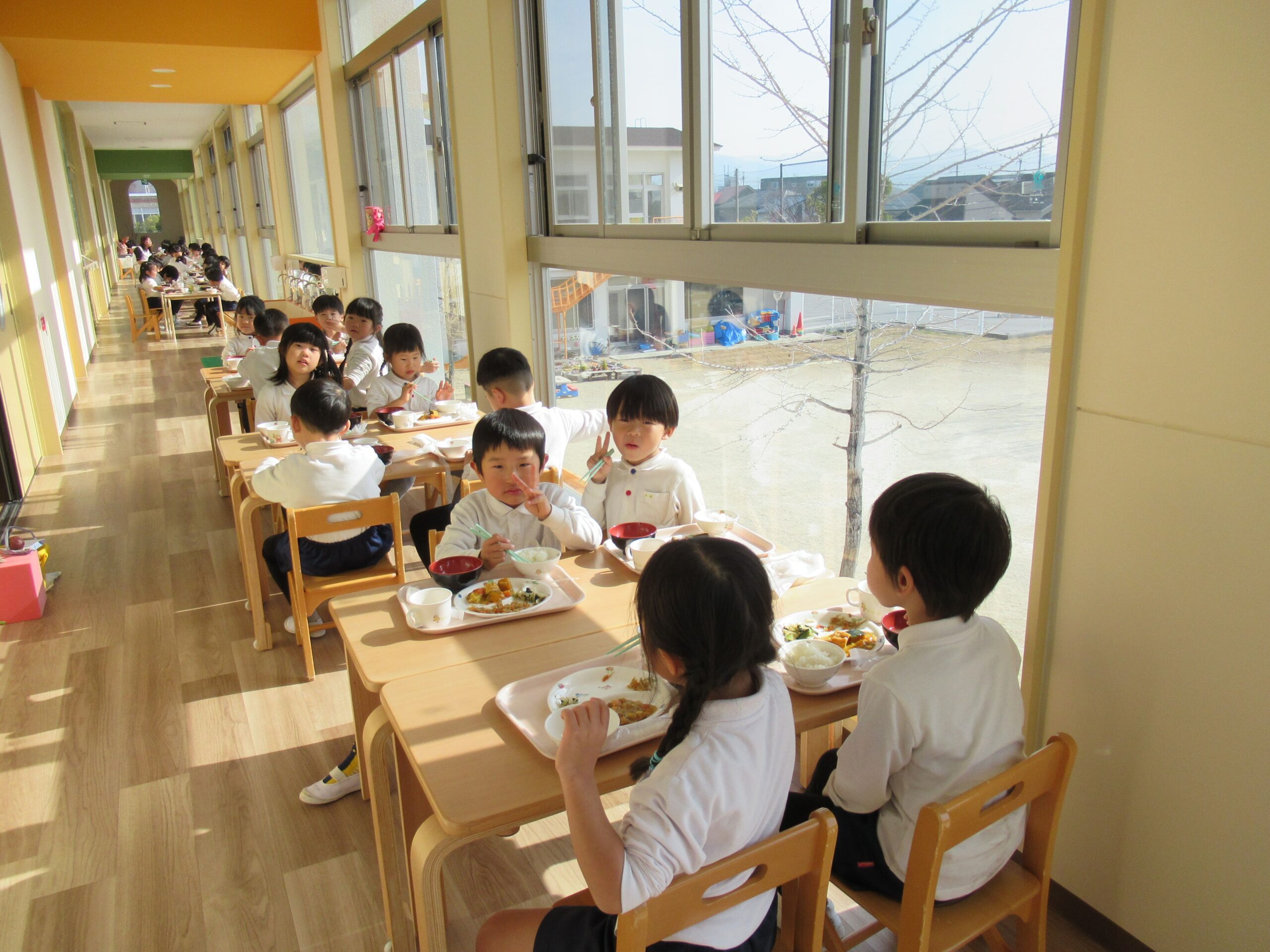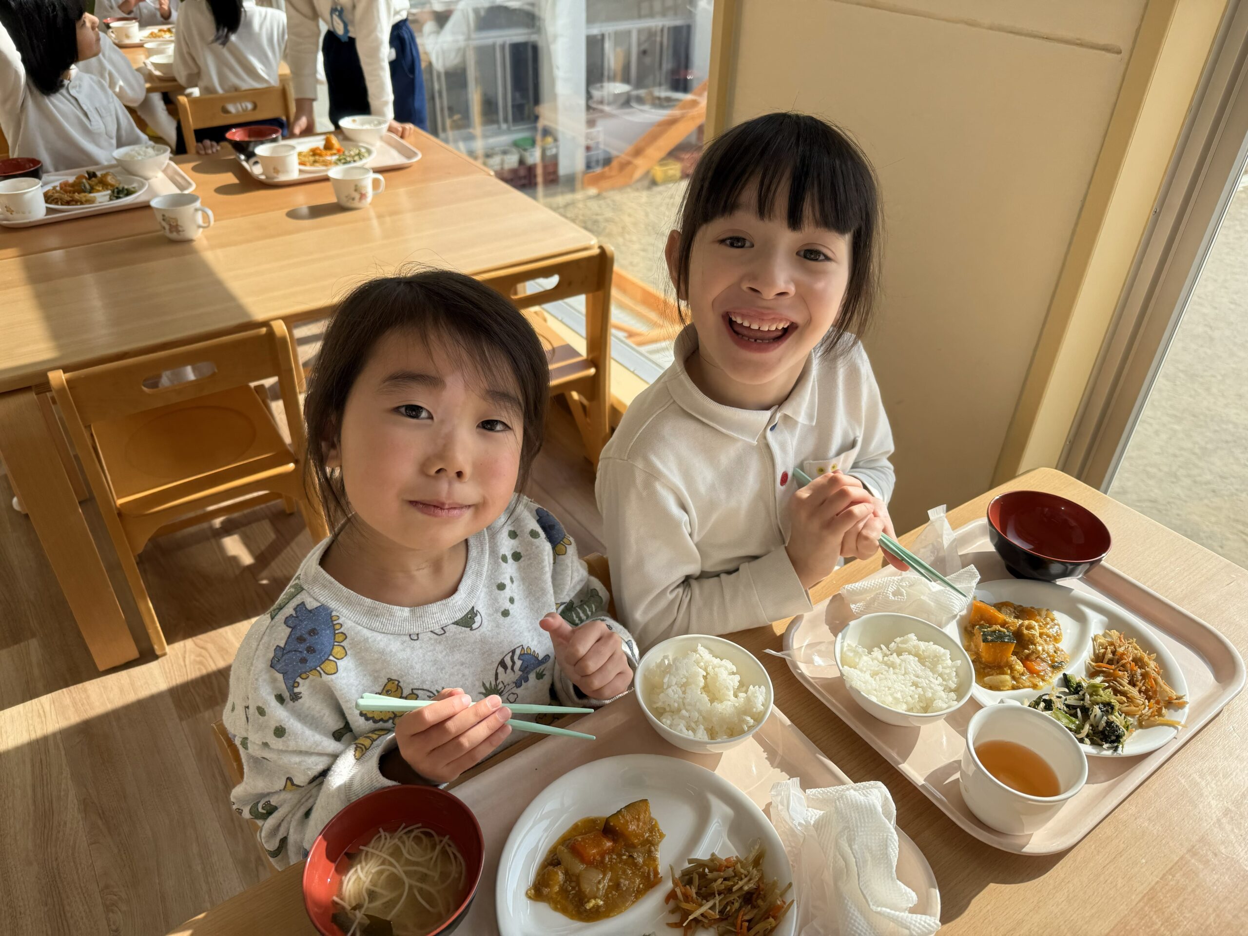 今日は日差しが暖かく、廊下に出ると体もポカポカしてきました。そこで、どーなつ組とわっふる組は、廊下に机を出して食事をすることに。テラス席風の”しろはとレストラン”を開店しました。大好きな友達と一緒に食べる給食はいつも以上に美味しくて、自然と笑顔がこぼれていました😊