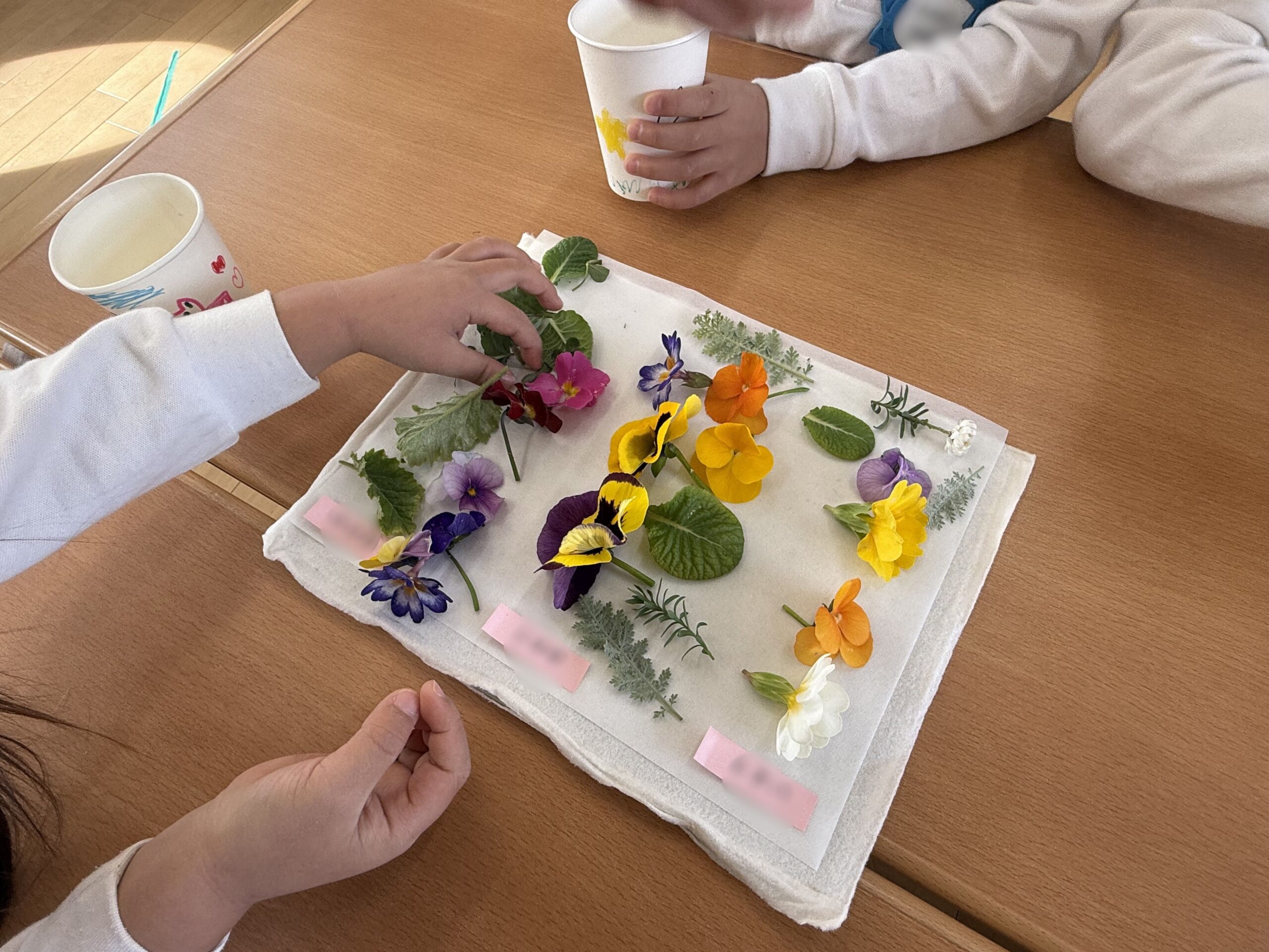 保育室に帰ってからは、集めた花や葉っぱを重ならないように並べ、押し花づくりに挑戦です。