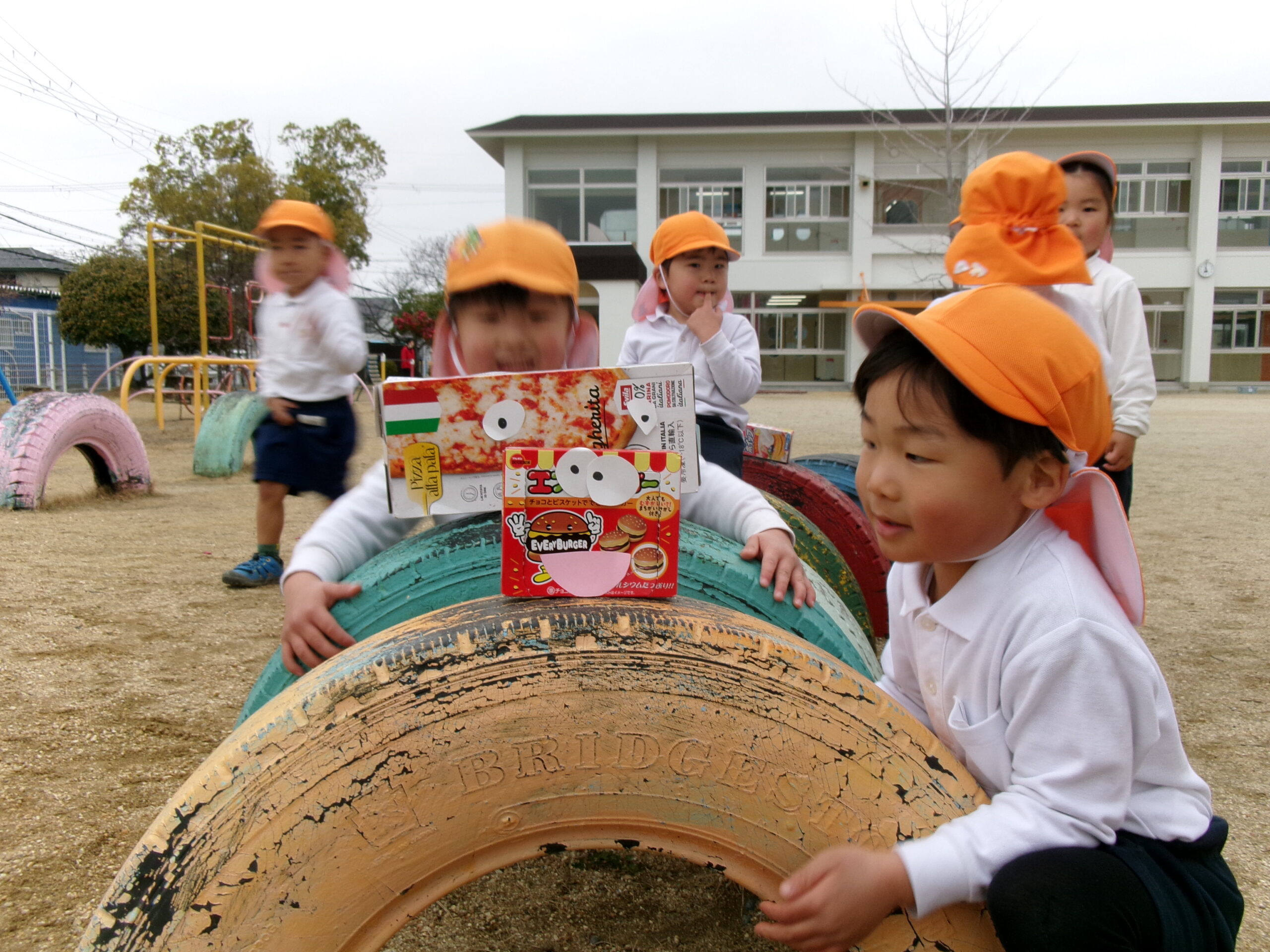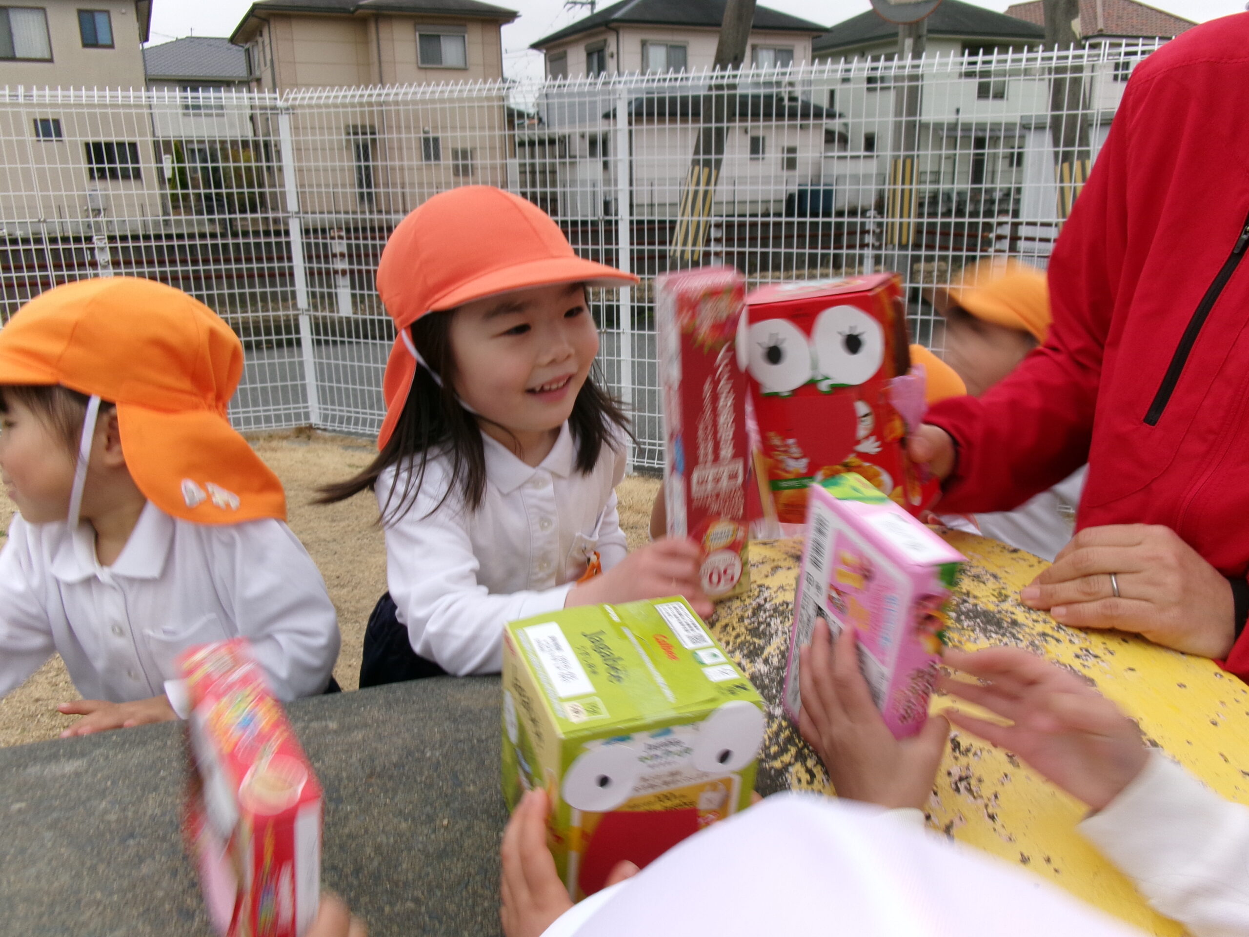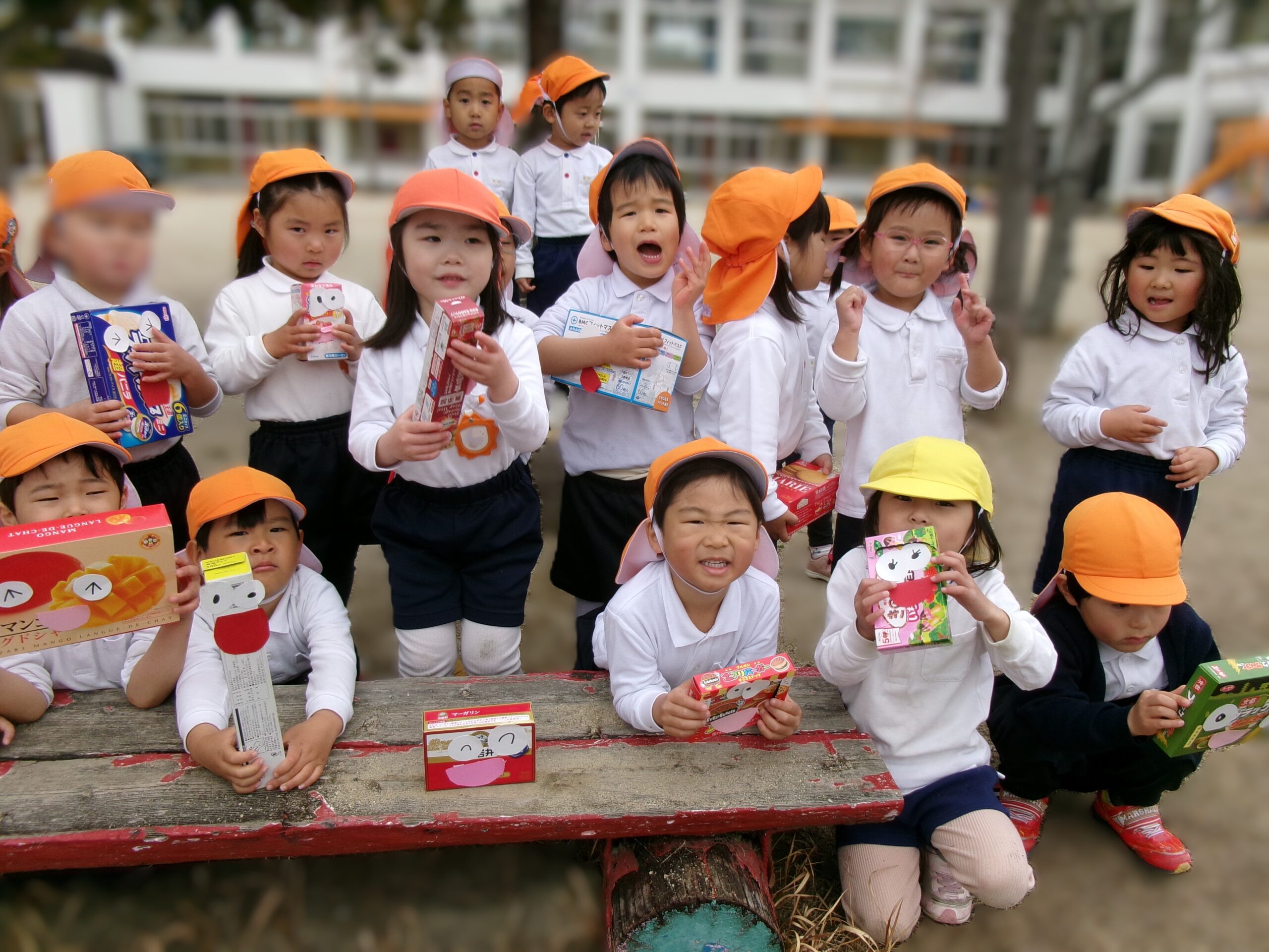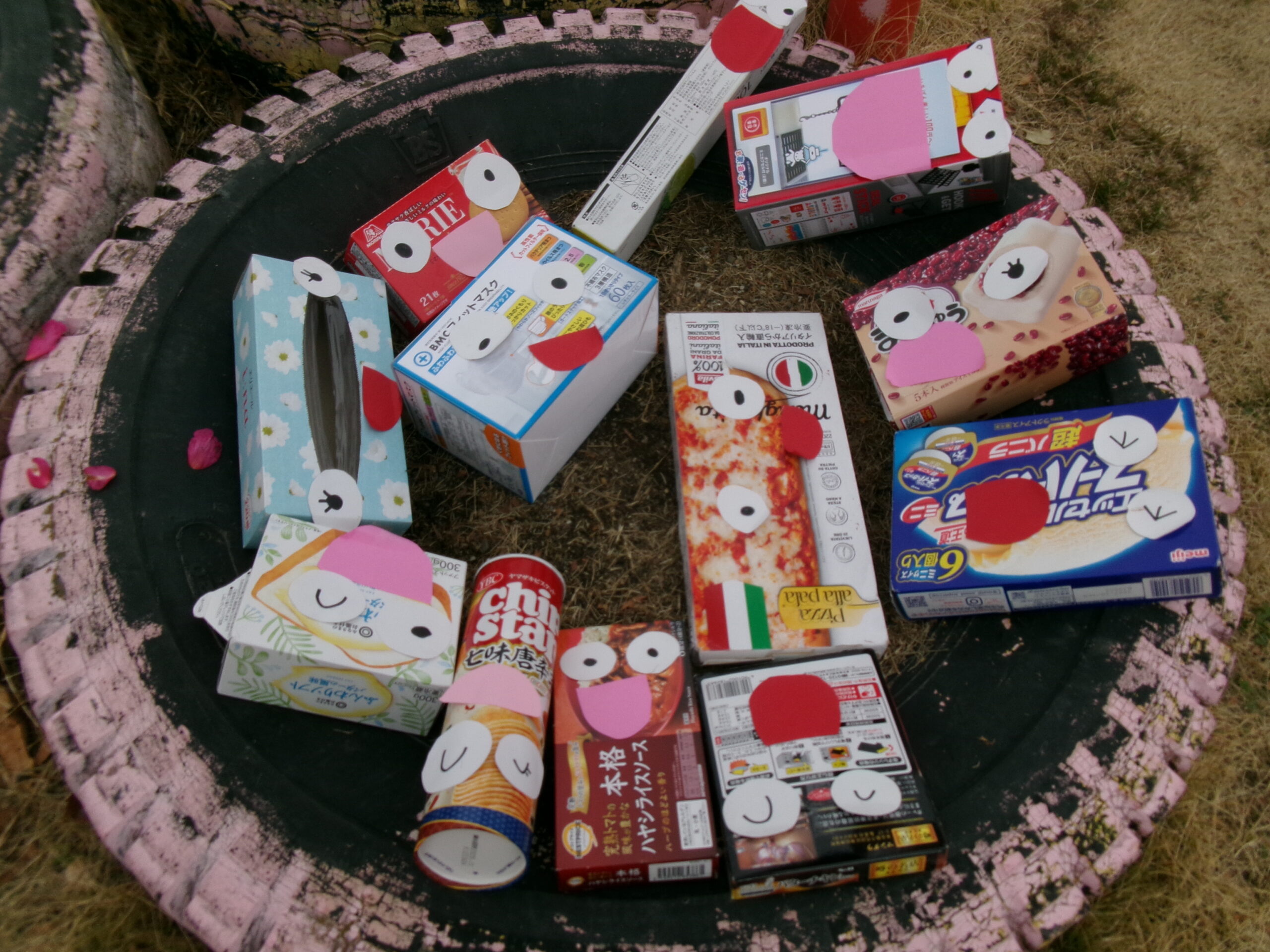 今日くっきー組では、ご家庭から持ってきていただいた空き箱に、顔を付けて人形を作りました。