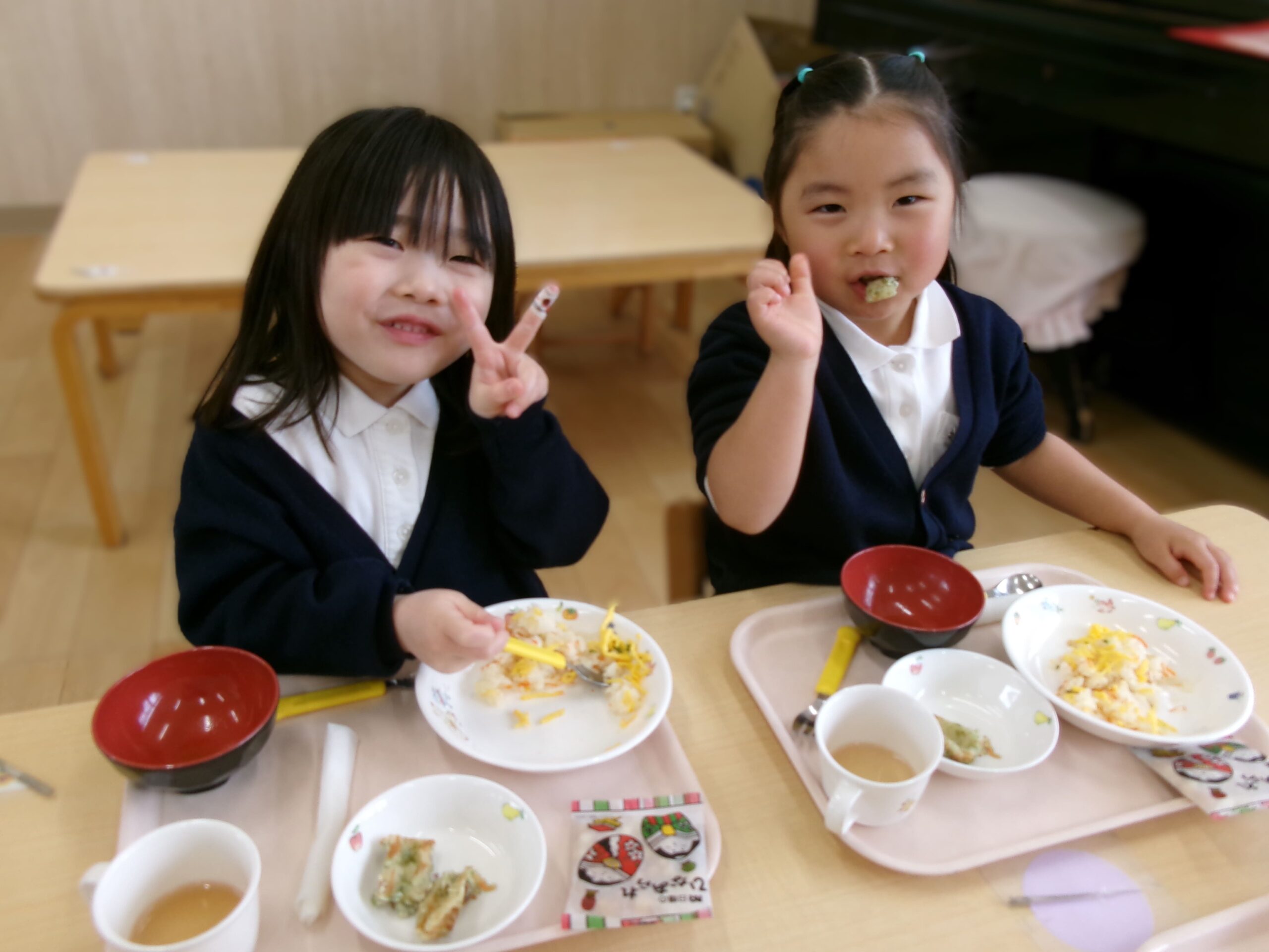 給食の「ちらし寿司」も美味しかったね!みんなの健やかな成長を玄関に飾ってあるお雛様も願ってくれていますよ🌸