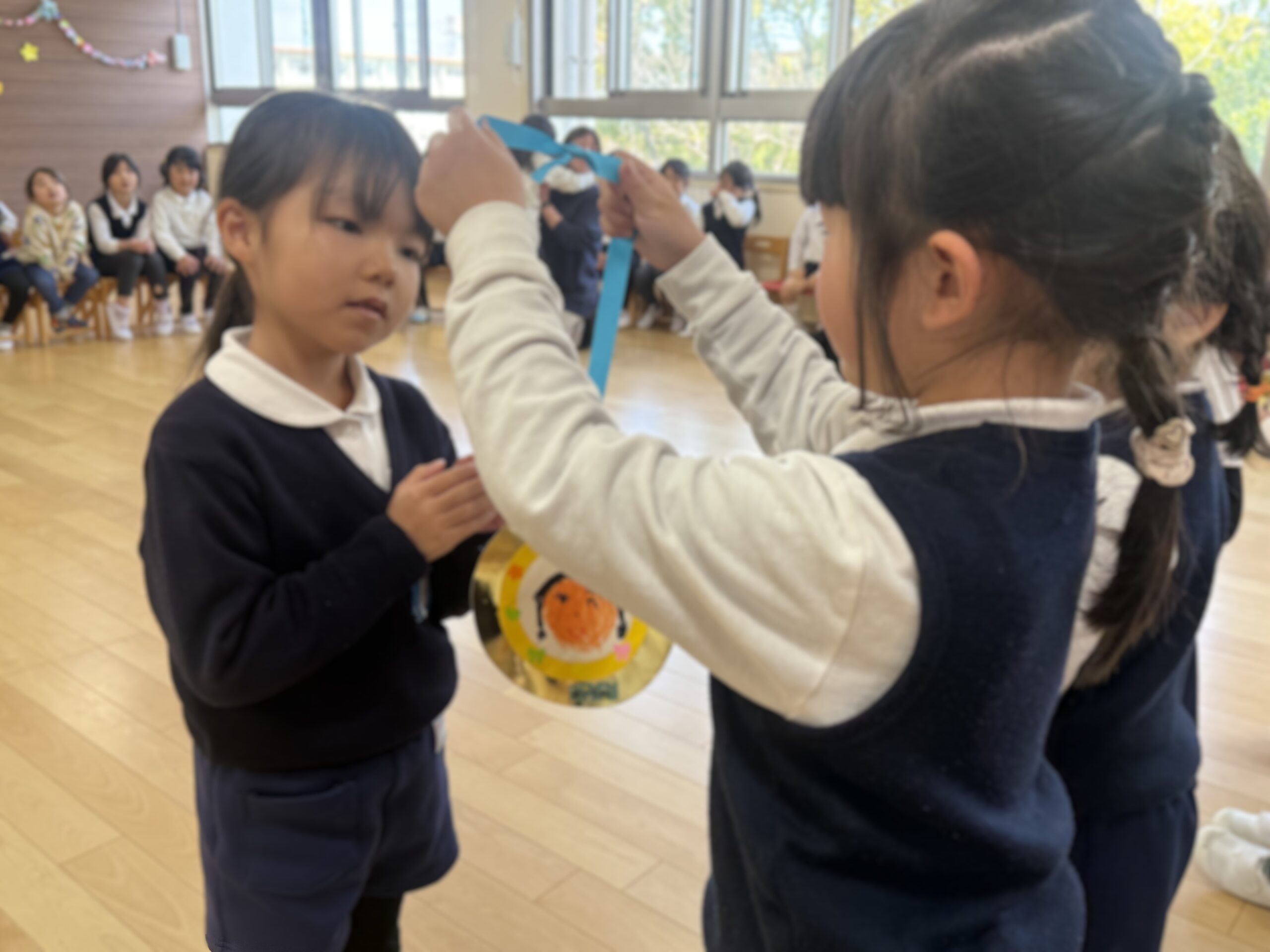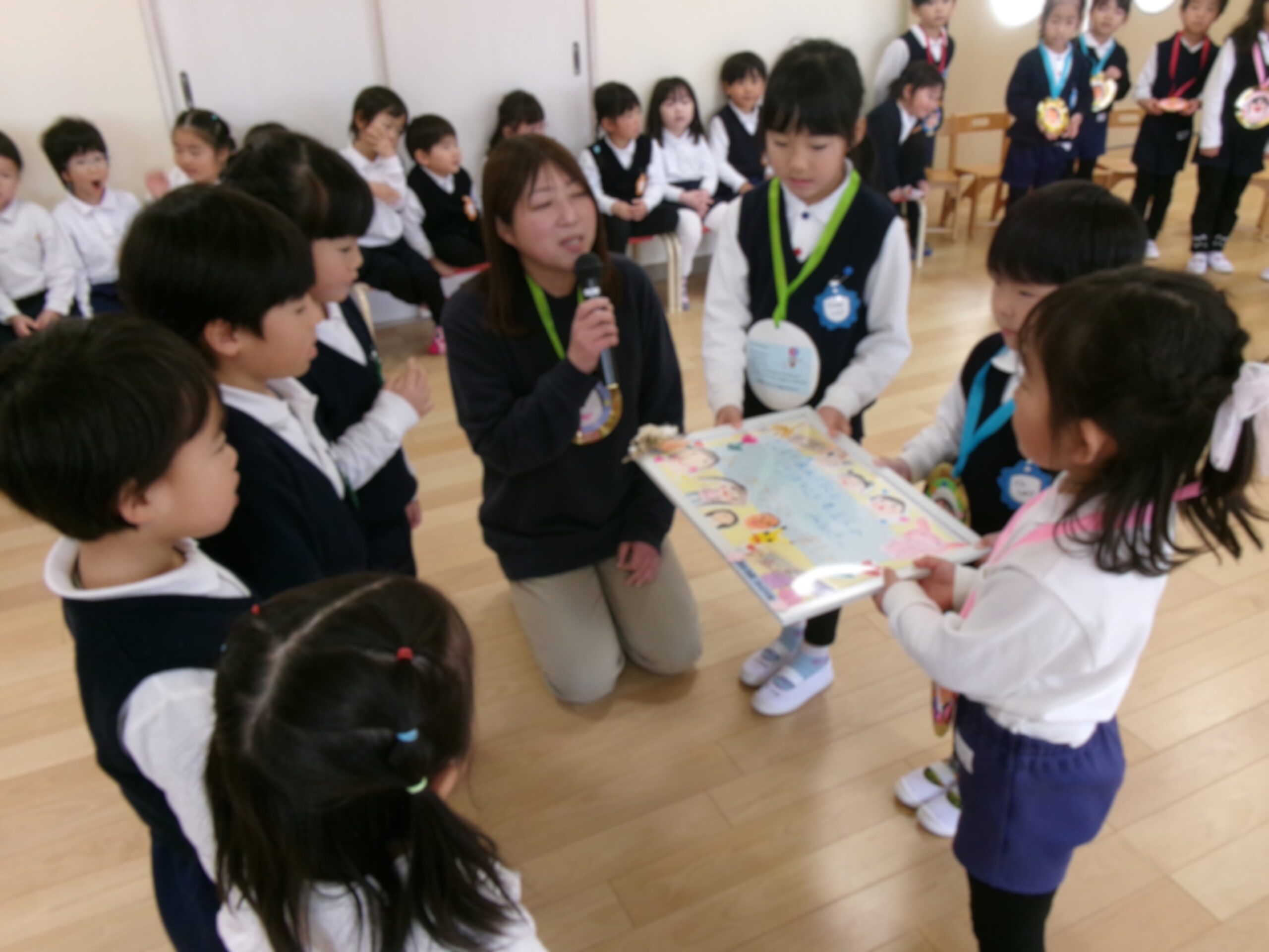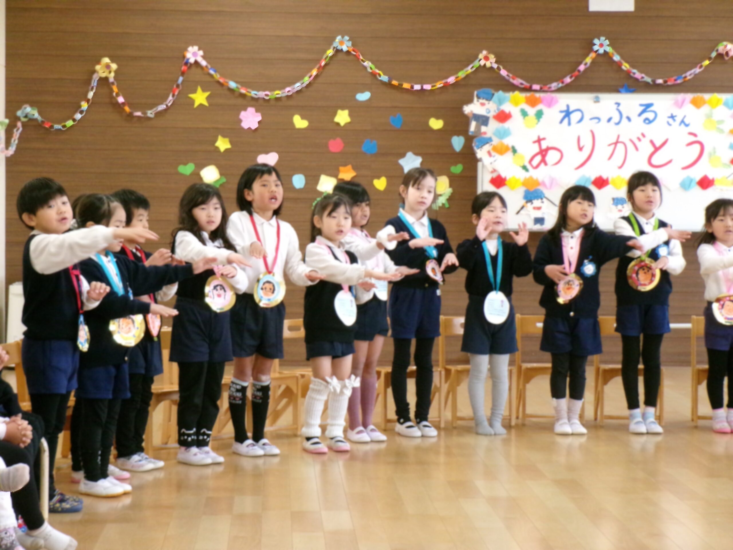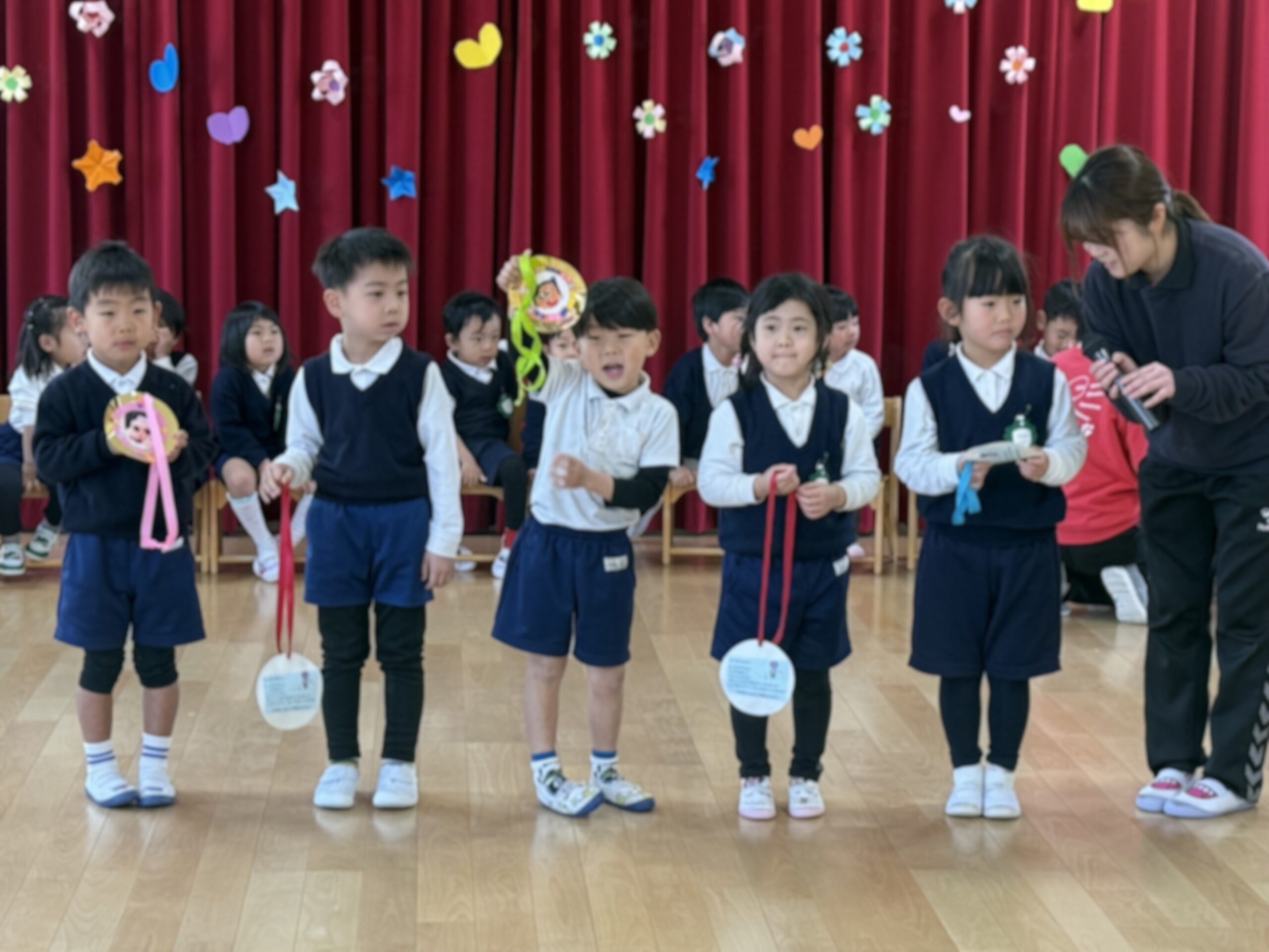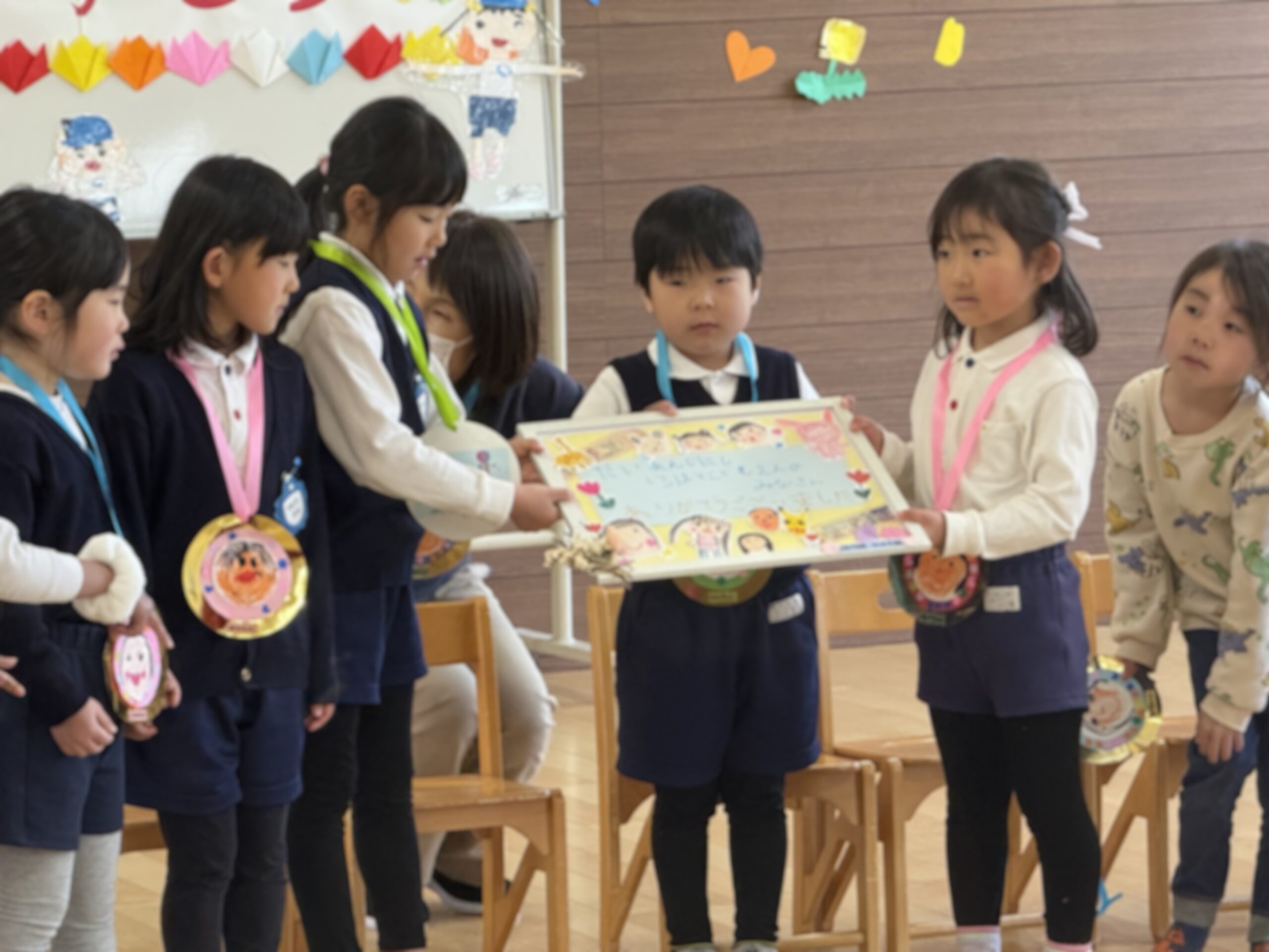 くっきー組、どーなつ組からは「♪一年生おめでとう」の歌のプレゼントを、どーなつ組からは似顔絵の描かれたメダルをプレゼントしました。