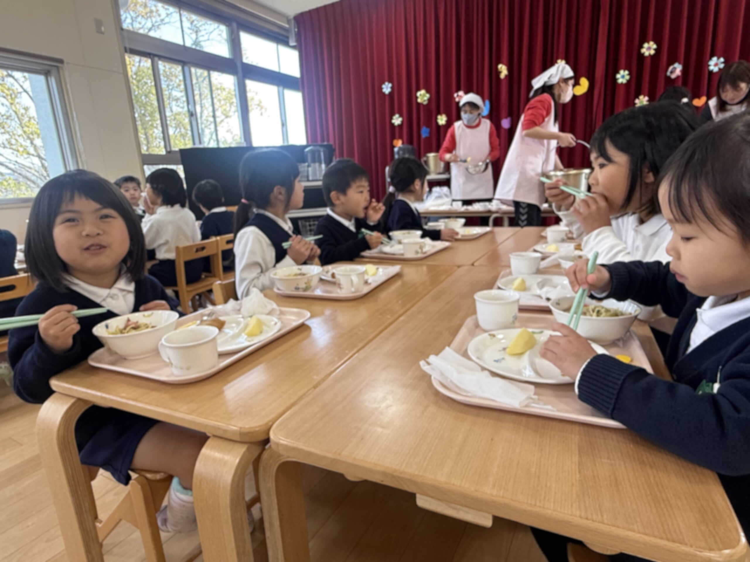 その後、4・5歳児一緒に「きゃらめるホール」で給食を食べて、とても良い時間を過ごすことができました。