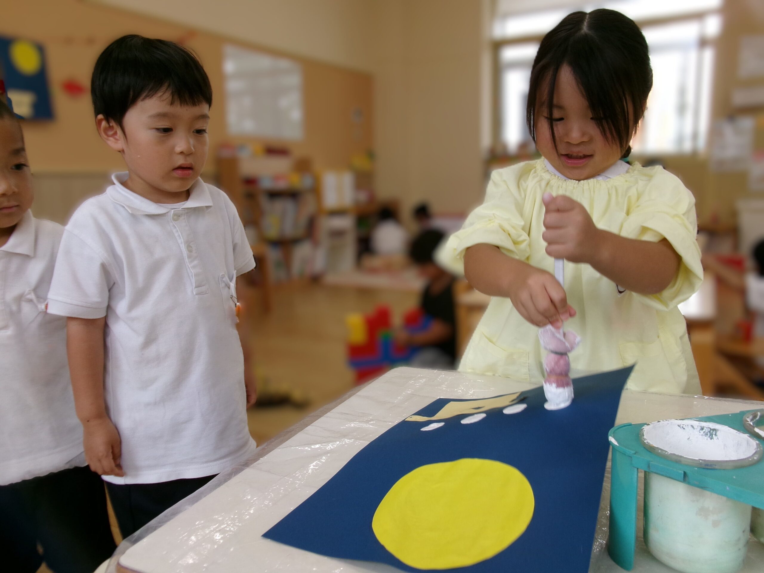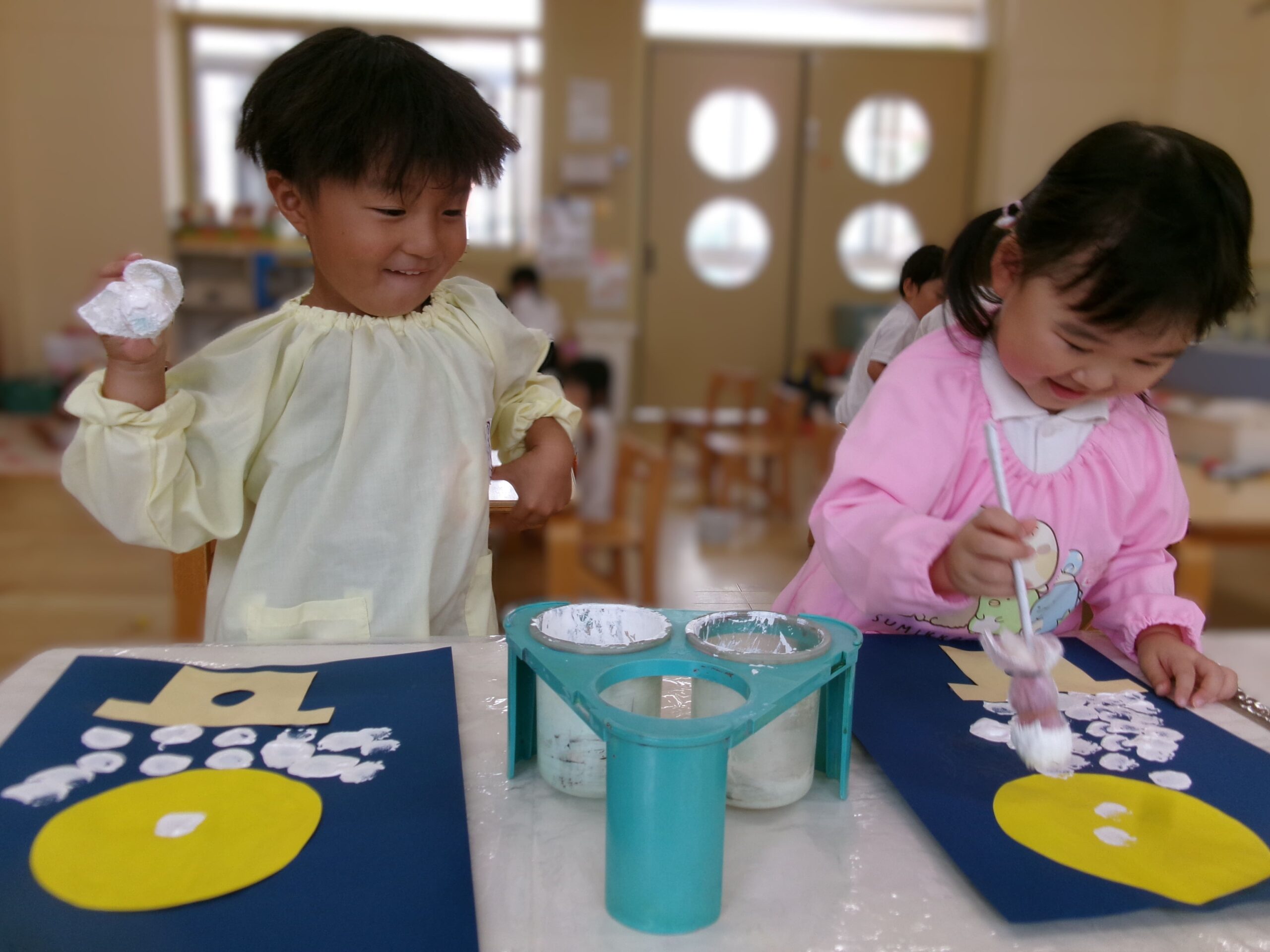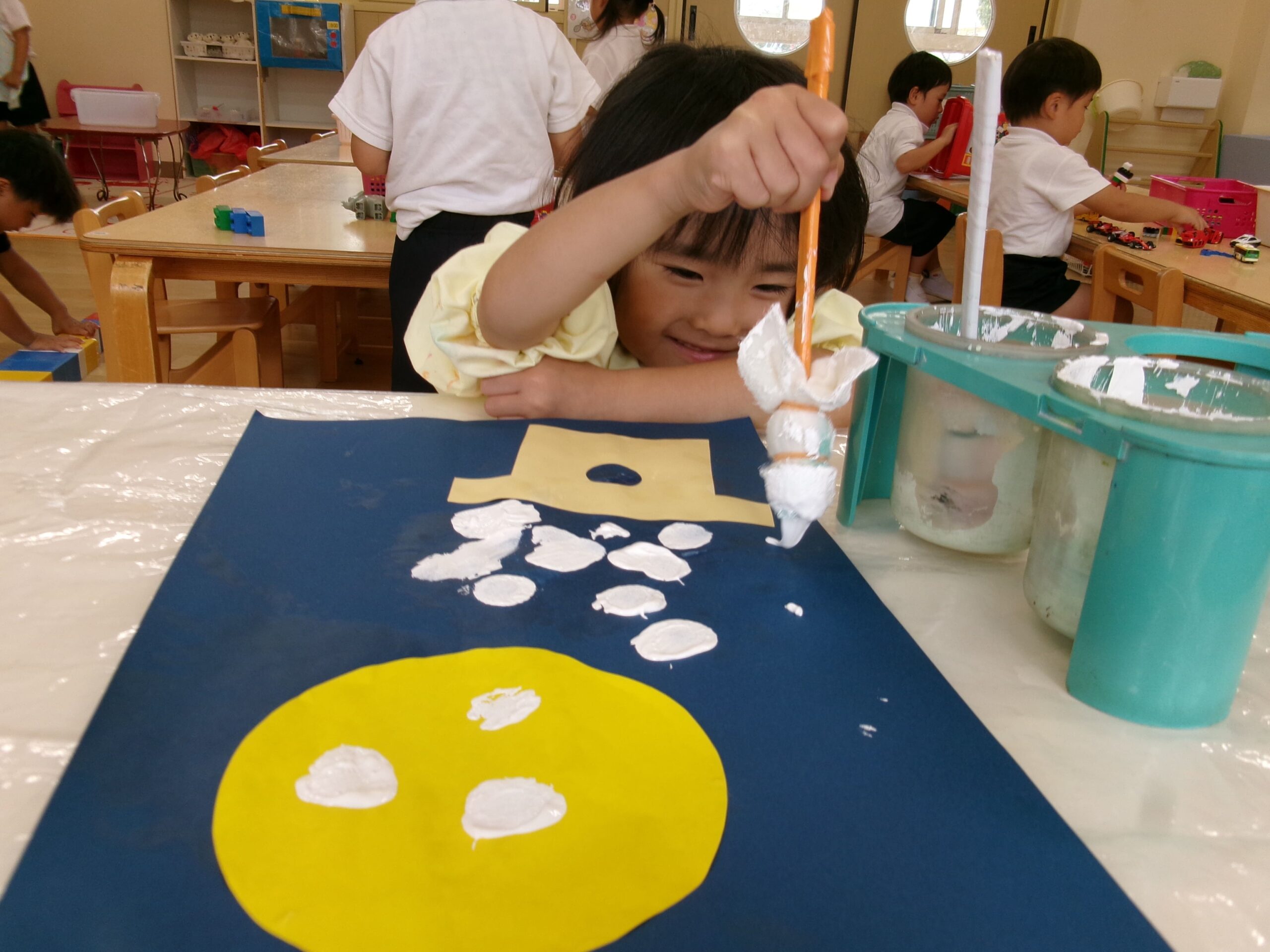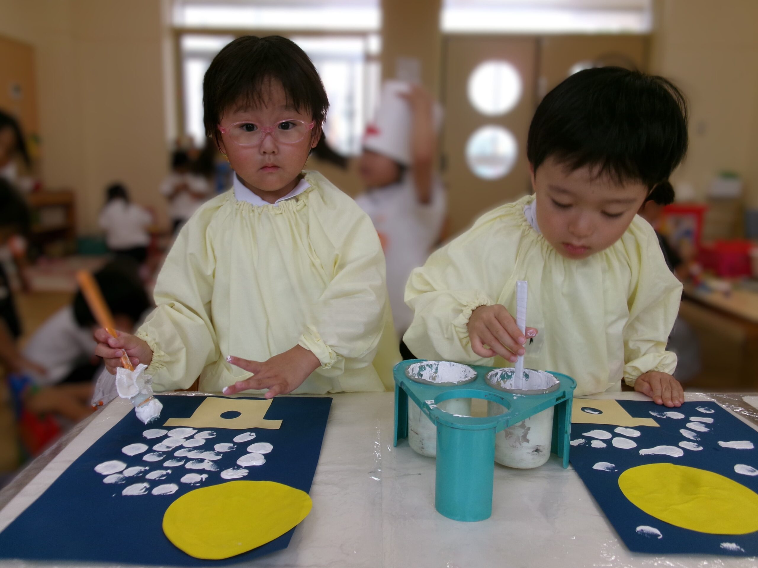 くっきー組では「タンポ」を使って「お月見」の製作をしました。「お月様にもお団子食べさせてあげよ~🥰」と言いながら、たくさんお団子をスタンプして喜んでいました。