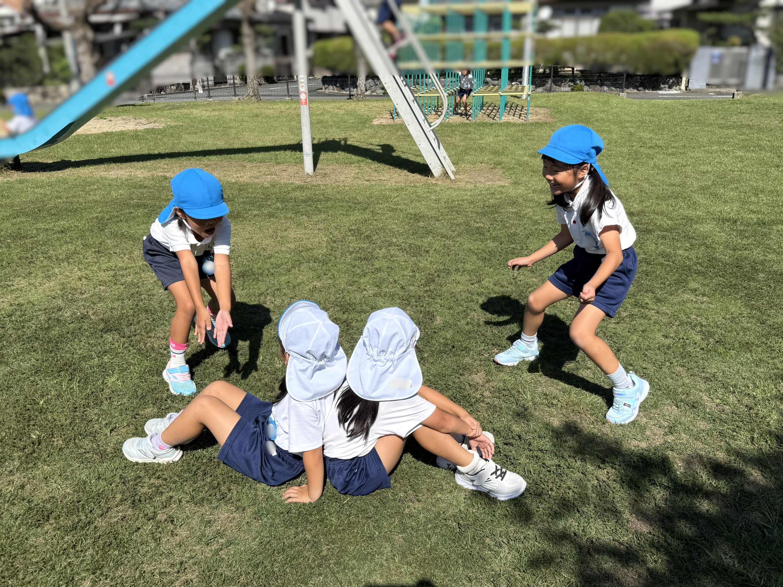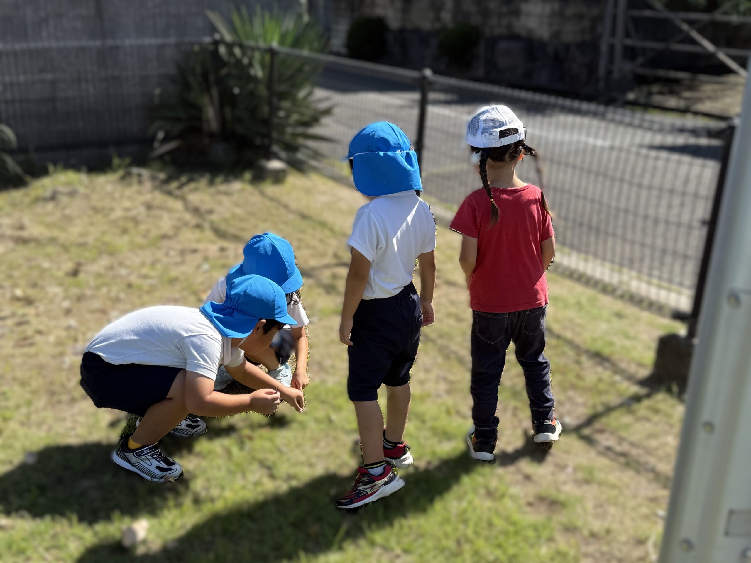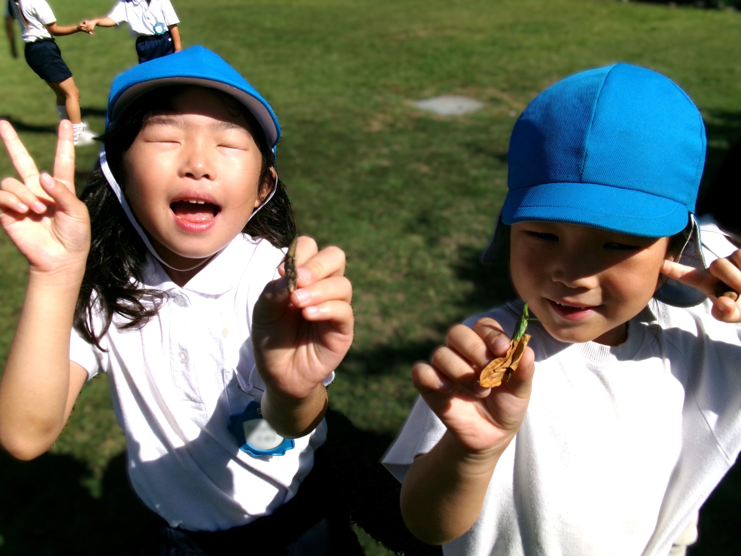 秋晴れの今日、あかしあ公園まで散歩にでかけました。追いかけっこをしたり、虫探しをしたりと思い思いに遊びはじめました。わっふる組で大人気のバッタを見つけて大喜び。連れて帰ろうかと相談しましたが、「遠い所に連れて帰ると家族に会えなくてかわいそう」というTちゃんの提案で、そっと逃がしてあげることに。たくさん遊んで笑顔いっぱいのお散歩でした♪